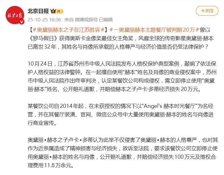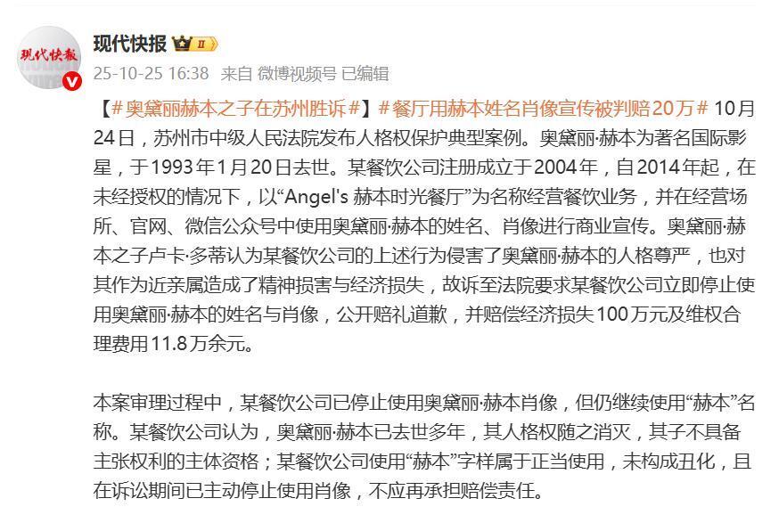这案子经过苏州工业园区法院一审和苏州市中级人民法院二审,判决结果很清楚:餐厅必须马上停用 “奥黛丽・赫本” 这个名字,在报纸上公开道歉,还要赔 20 万经济损失。