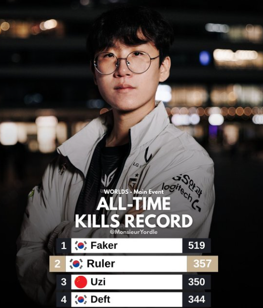 2025年10月20号,英雄联盟S赛榜单那页面数字一跳,Ruler,357杀,超过Uzi的350,直接第二了,Faker还是那个Faker,519杀,前四里唯一个不是AD的,榜首坐得结结实实,下面三个全AD,Ruler,Uzi,Deft,第四344杀。
