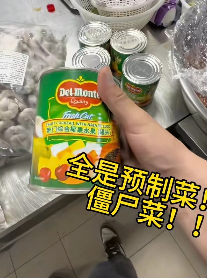 可等到顾客察觉到问题,跑到后厨一探究竟后,居然发现后厨有大量的预制菜包装,蔬菜水果也没有例外,就连主食都是用八宝粥进行替代。