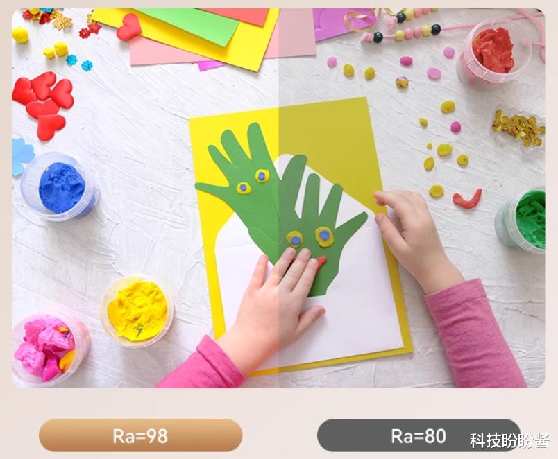 而且显色真的绝,Ra≥98的高显色灯珠,配合五域环控光学系统,我看笔记本上的彩色标记、娃画的水彩画,颜色都特别准,一点不偏色。之前用旧台灯,红色看着偏橙色,现在色彩还原度高,更鲜亮了。