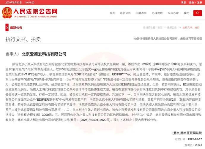 法院判决爱德发公司在2025年6月24日之前,在公众号公开致歉(保留2日)并赔偿3000元。因爱德发公司未主动履行,法院于2025年6月17日通过“人民法院公告网”强制执行判决内容。