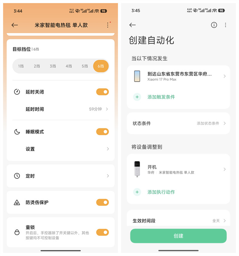 而且还可以定制化个性使用场景,比如设置回家自动暖被窝、离家关机断电等功能,简直太贴心了。即使我不在家,也能通过手机随时掌控电热毯的状态,给孩子最贴心的关怀。