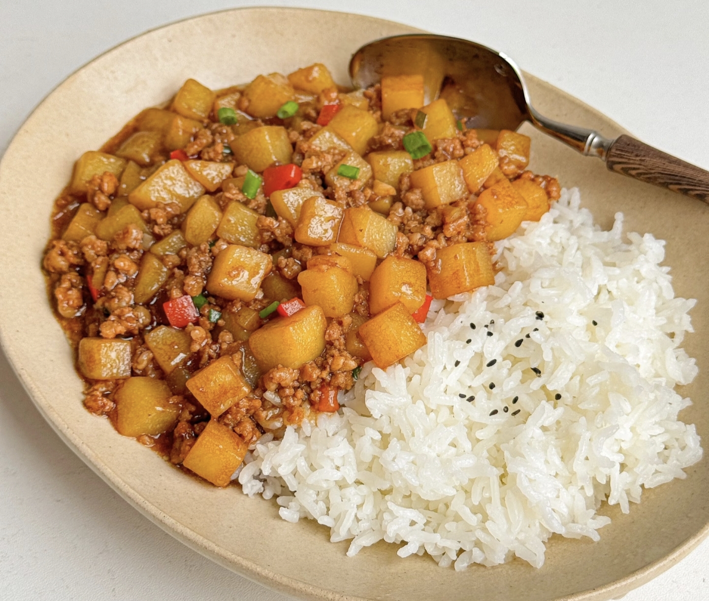 盛一碗热腾腾的米饭,用勺子压实倒扣在盘子里(拍照好看!),把土豆肉沫酱狠狠浇上去!撒点葱花或白芝麻(没有就省略),趁热拌匀,每一粒米都裹着肉香和土豆的绵软,挖一勺送进嘴里,土豆在舌尖化开,肉沫的咸香和酱汁的浓郁直冲天灵盖,这谁顶得住啊!