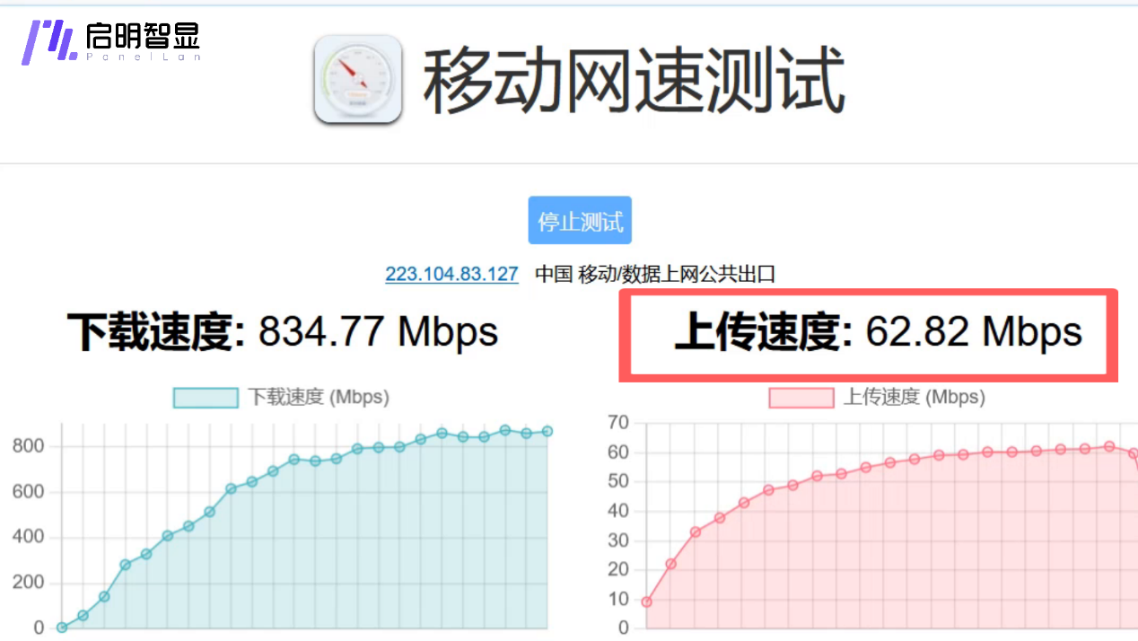 上行速度:峰值 [62.82] Mbps(均值约为 [57.44] Mbps)