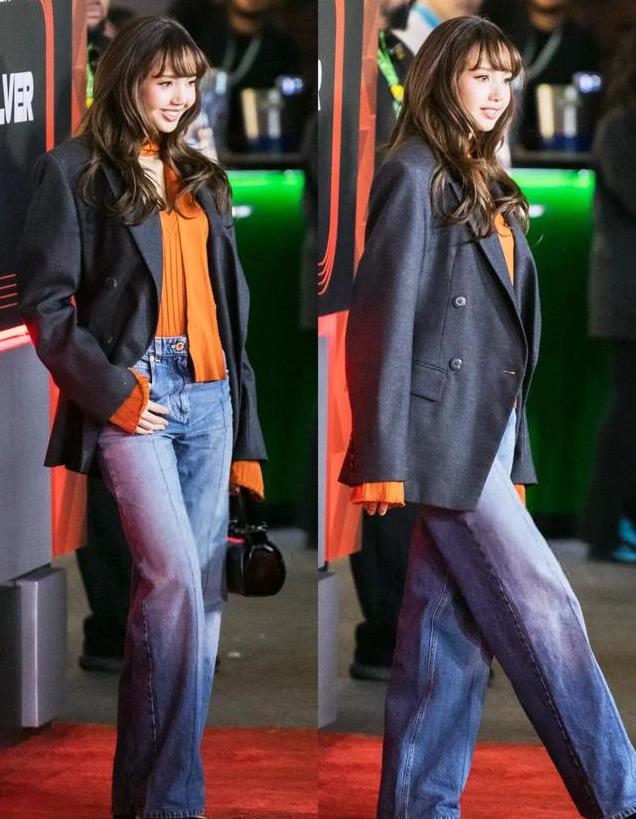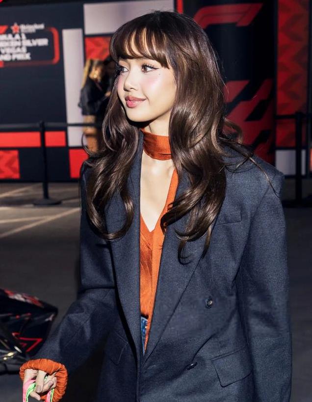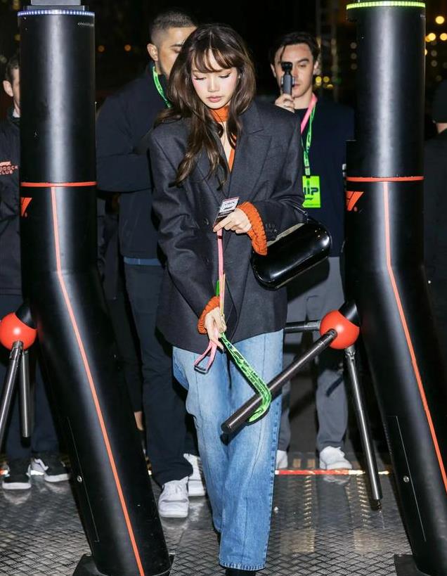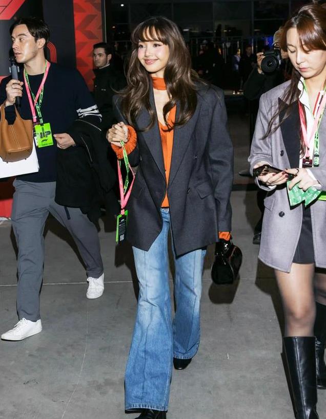 Lisa穿了一件橙色的V领针织衫,她搭配了一件黑色西装和牛仔裤,Lisa来观看F1比赛的这身造型很美,Lisa走这种都市少女风还挺迷人的。