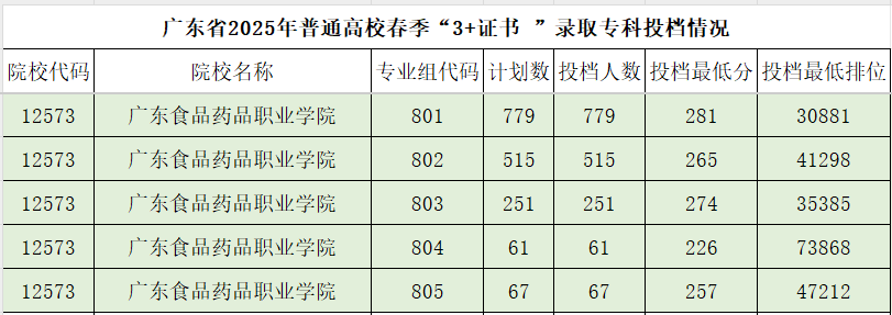 广东食品药品职业学院2025春季投档情况