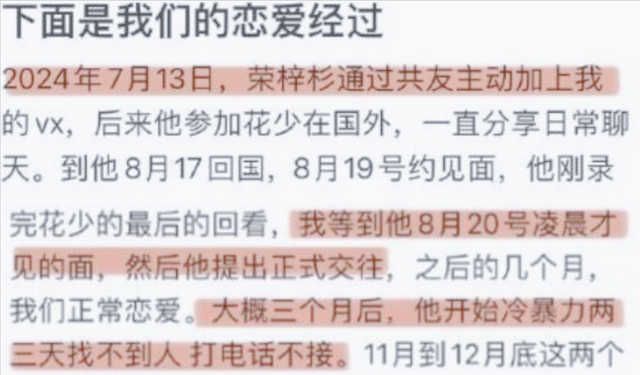 一、 甜蜜开端到冷暴力:那段见不得光的地下恋据李禹熹自述,2024年7月,荣梓杉通过共同好友添加其微信,并于8月20日主动提出交往。由于男方艺人身份,恋情始终未公开。