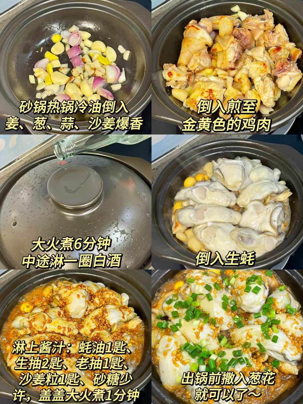 等鸡肉炖到八分熟,就该放生蚝啦!这是保证生蚝鲜嫩的关键步骤,早放易老,晚放不入味。把腌制好的生蚝连同少许腌汁一起倒入锅中,大火快速翻炒3分钟,看到生蚝微微收缩就关火,此时生蚝刚好熟透,口感滑嫩如布丁。最后撒上枸杞、少许盐和白胡椒粉调味,撒一把葱段点缀,盖上锅盖焖2分钟,让味道融合一下,原汁原味的生蚝鸡煲就做好了。