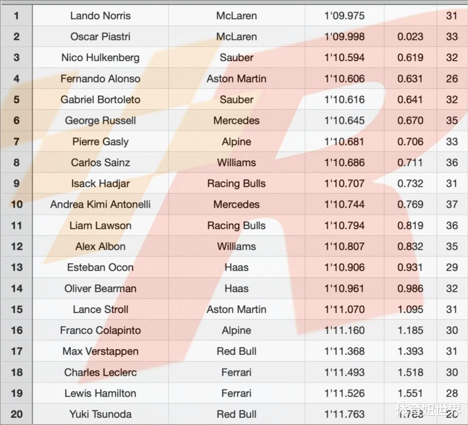 威廉姆斯车队的阿尔本率先以中性胎超越拉塞尔,但梅奔车手迅速将榜首给夺了回去,但很快又被塞恩斯给抢走。随后迈凯伦车手开始发力,皮亚斯特里两度提高榜首标准,最终来到1分09.998秒。然而其队友诺里斯却在终场前飙出了1分09.975的全场最快成绩,以0.023秒优势夺得榜首。