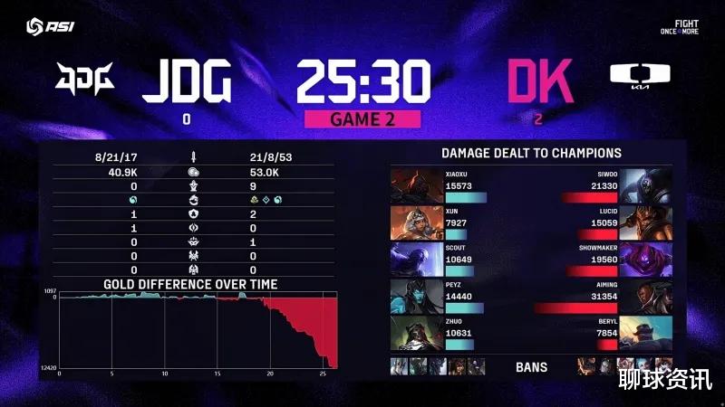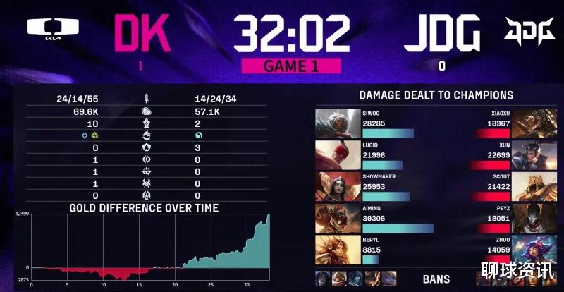 DK通过中野联动和上路单点突破压制JDG,ShowMaker的玛尔扎哈对Scout瑞兹形成全场压制。JDG在中期决策犹豫,未能有效应对DK的节奏,最终被零封。