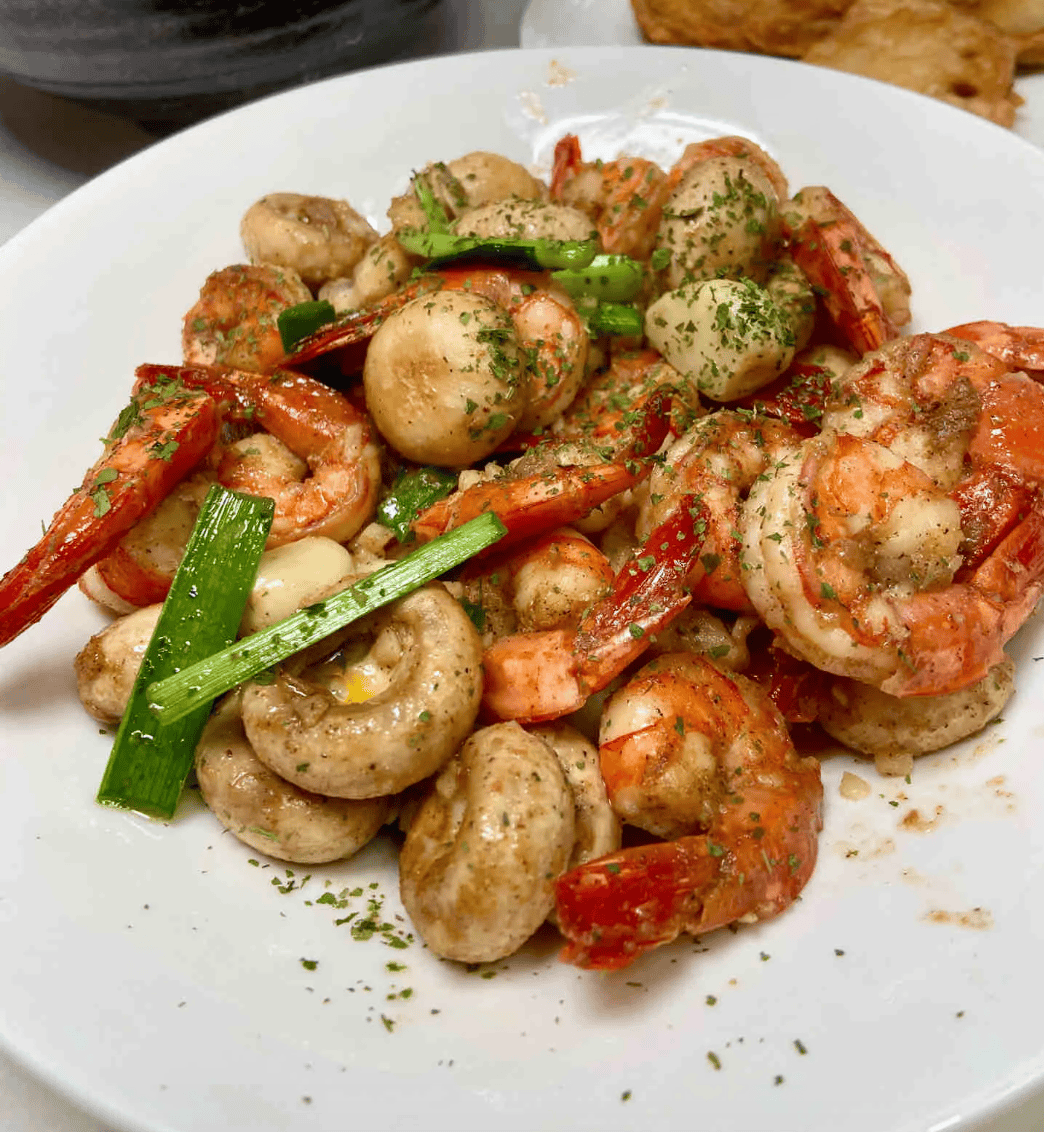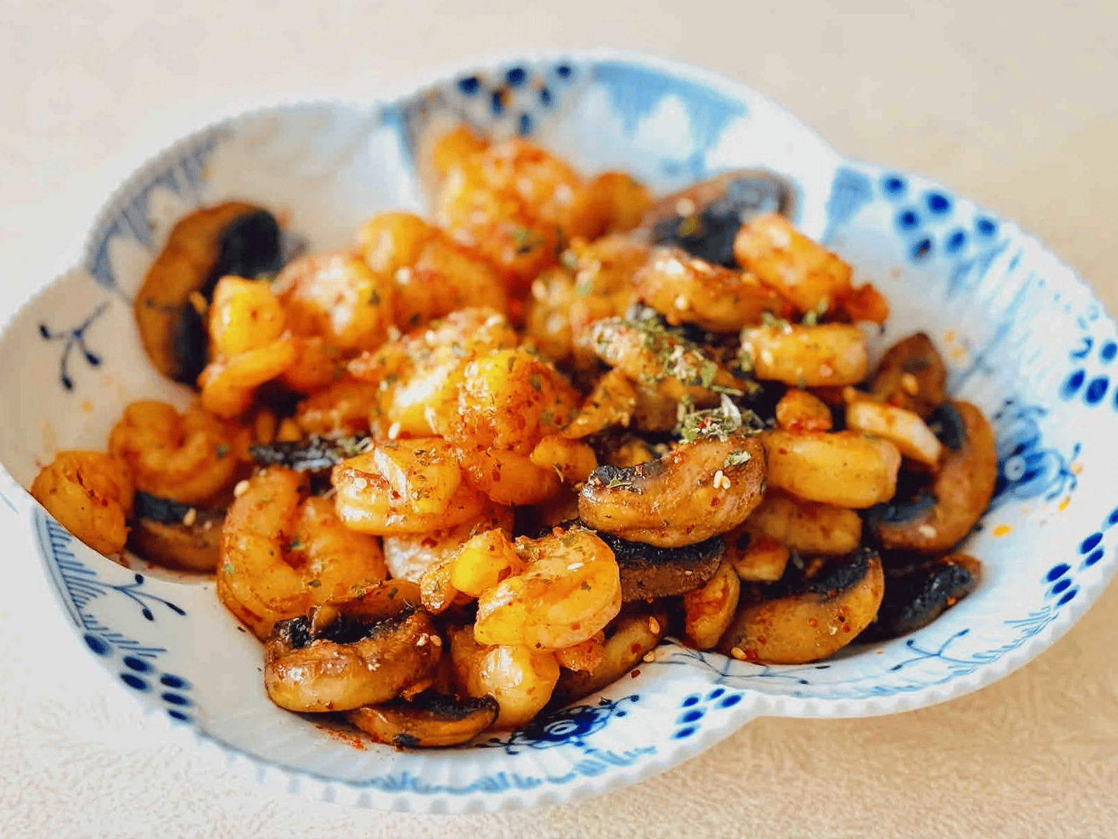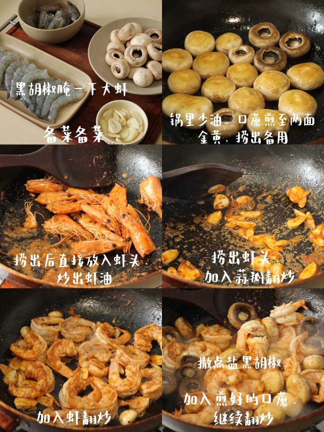 虾仁煎至两面金黄,倒入口蘑,撒上海盐黑胡椒、辣椒粉、欧芹碎即可出锅
