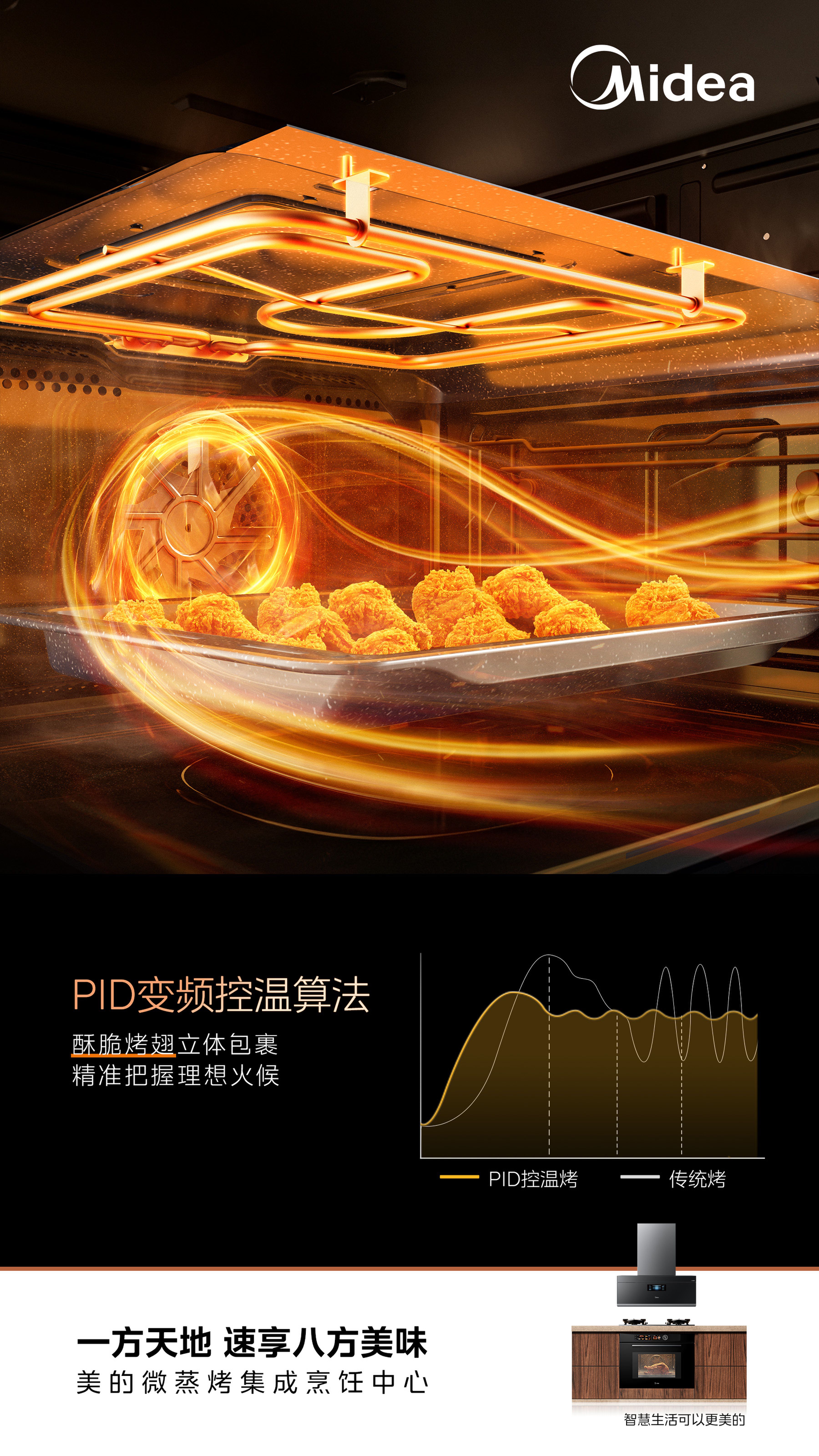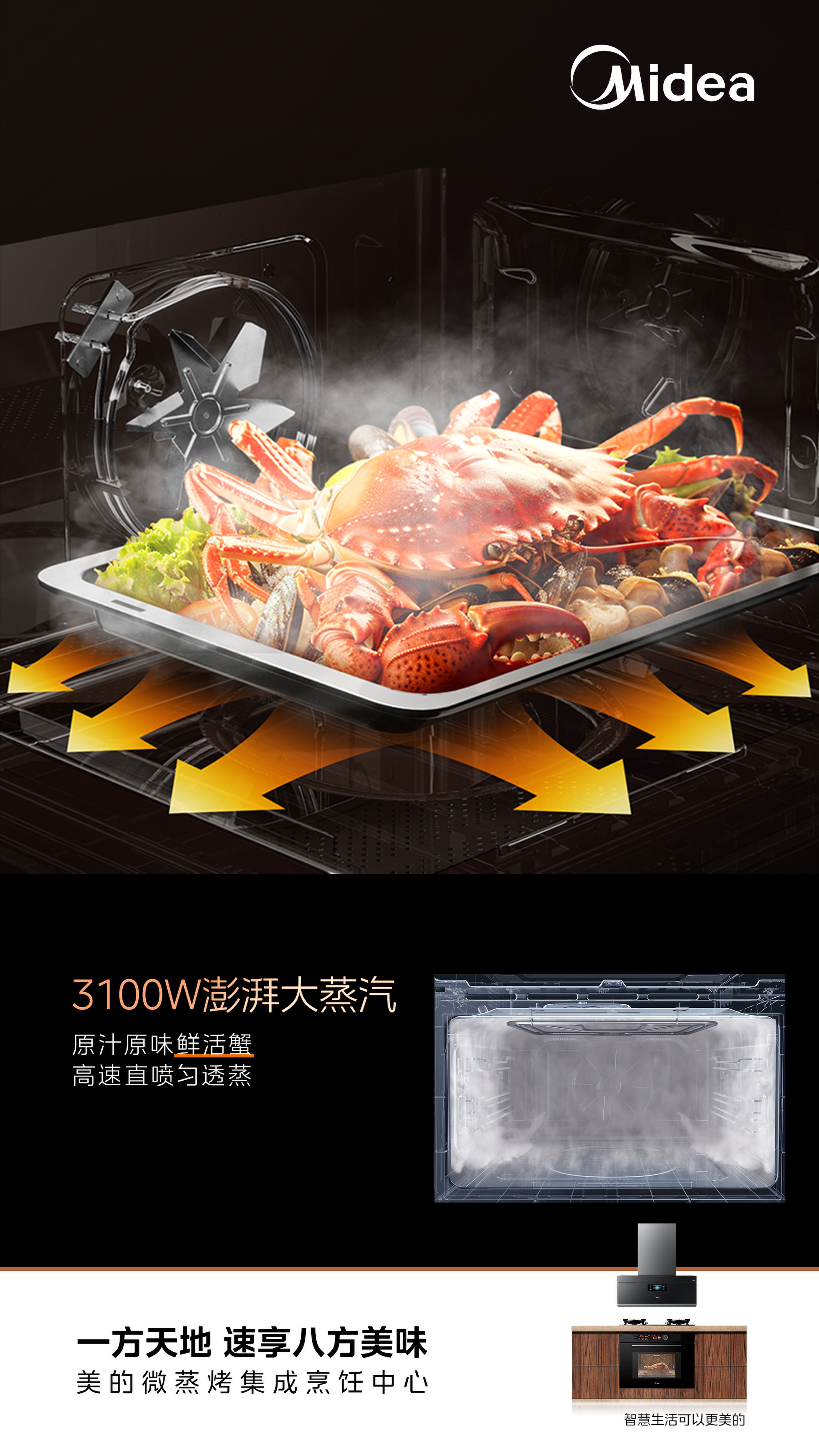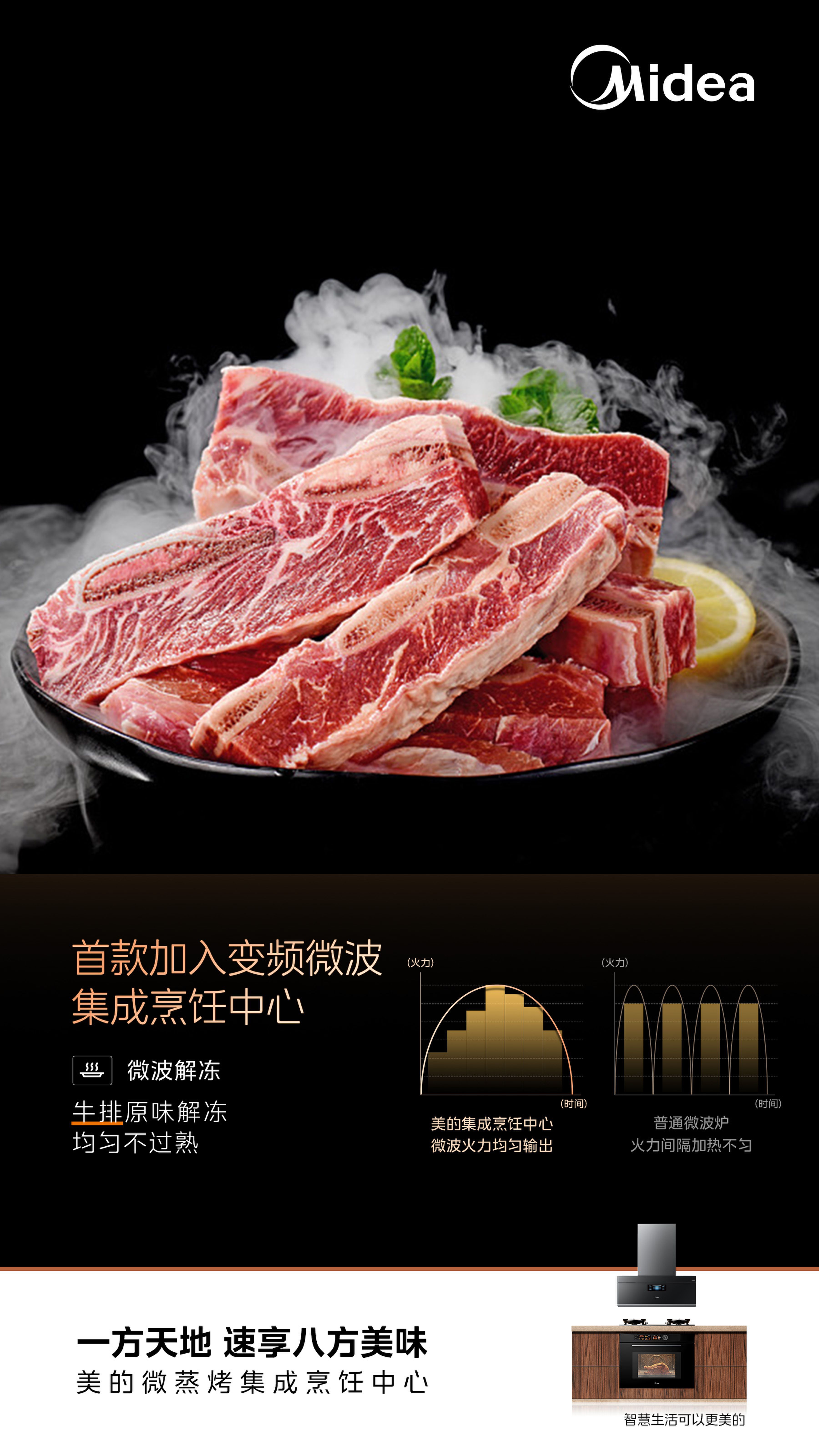 为满足用户对厨房美观度和高效烹饪的需求,美的创新研发微蒸烤集成烹饪中心,是行业首款加入“变频微波”功能的产品,不仅实现烹饪功能的进阶,而且通过与“蒸烤”功能叠加联动,让烹饪更高效,省时更省力。