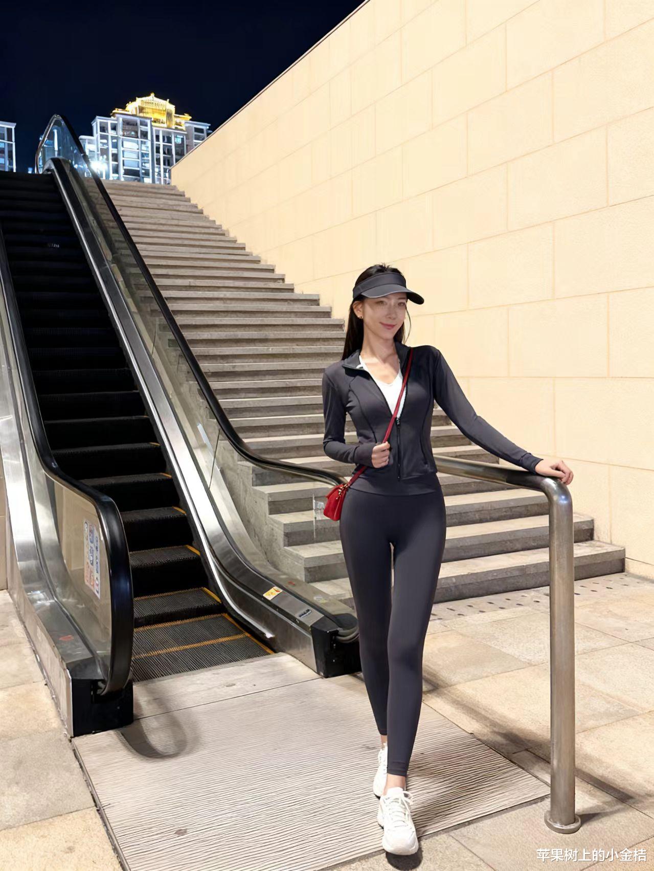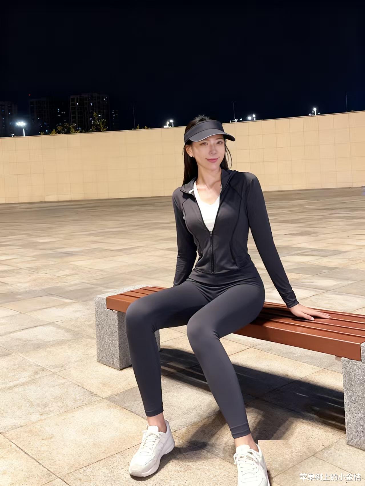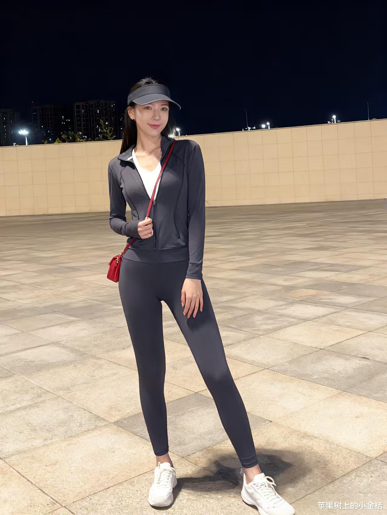 一身深灰黑色紧身运动套装,上衣是带拉链的长袖款式,紧身显身材。内搭一件白色上衣;