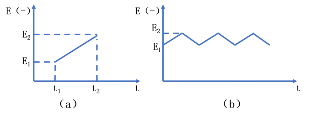 电化学极化随着极化的增大,反应物的表面浓度不断下降,扩散层中反应物的浓度梯度逐渐增大,导致扩散流量增加,扩散电流升高。当反应物的表面浓度下降为零时,就达到了完全浓差极化,扩散电流达到了极限扩散电流但此时,扩散过程并未达到稳定态,电势继续扫描相当于极化时间的延长,扩散层的厚度越来越大,相应的扩散流量逐渐下降,扩散电流降低。这样,。在越过峰值后电流的衰减符合Cottrell方程线性扫描伏安法中常用的电势扫描波形如图5所示。