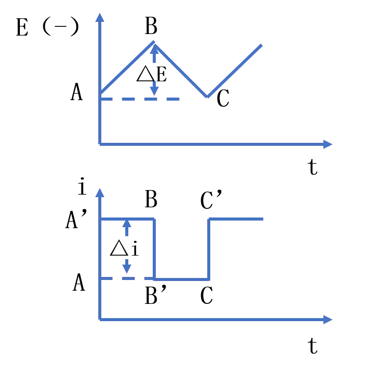 由于采用的是小幅度测量信号,di=iC−ddEdt=const。由于(dEdt)=(dEdt)=v,所以在B点电势换向瞬间,电流v突变为-Cd所以,电势换向前后电流的突跃值Δi为