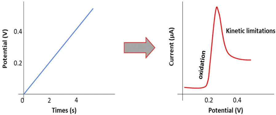 O+ne–R,典型的伏安曲线如图当电势从没有还原反应发生的较正电势开始向电势负方向线性扫描时,还原电流先是逐渐上升,到达峰值后又逐渐下降。