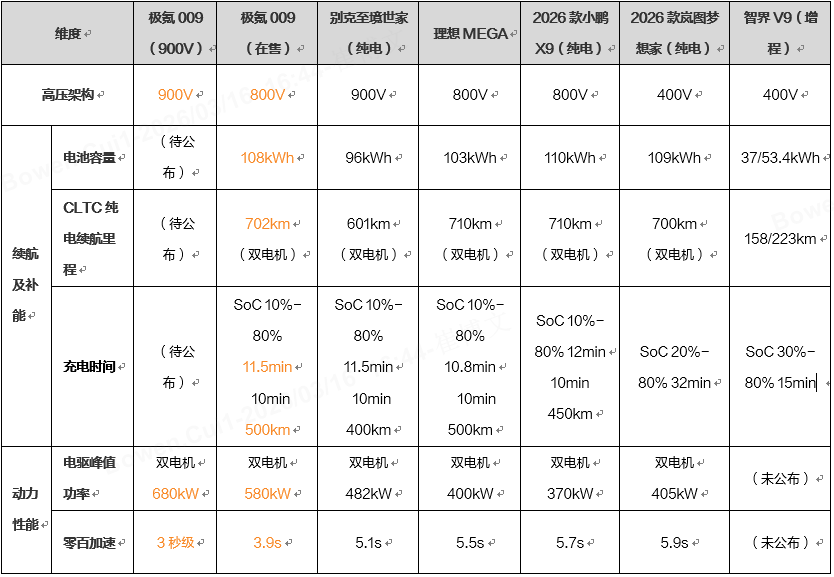 在三电性能层面,现款极氪009作为新能源首款800V纯电MPV,至今仍领先同级。目前市面上岚图梦想家等多数高端MPV还停留在400V架构,即便小鹏X9等跟进800V平台,现款极氪009依旧凭借580kW峰值功率、3.9秒破百的性能,以及10%-80%最快11.5分钟快充、充电10分钟补能约500公里的补能效率,实现差异化领先。