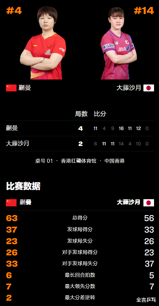 第五局大藤沙月先赢2分后迅速被追平,蒯曼随后继续发力取得6-2领先的优势,再次打出了自己的速度特长,同时不断利用其左手进攻线路变化调动对手,后半段10-4领先后没有错失1个局点,最终以11-4再胜将大藤沙月逼入绝境。