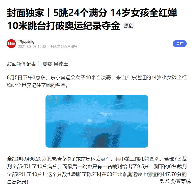 信息来源:封面独家丨5跳24个满分 14岁女孩全红婵10米跳台打破奥运纪录夺金