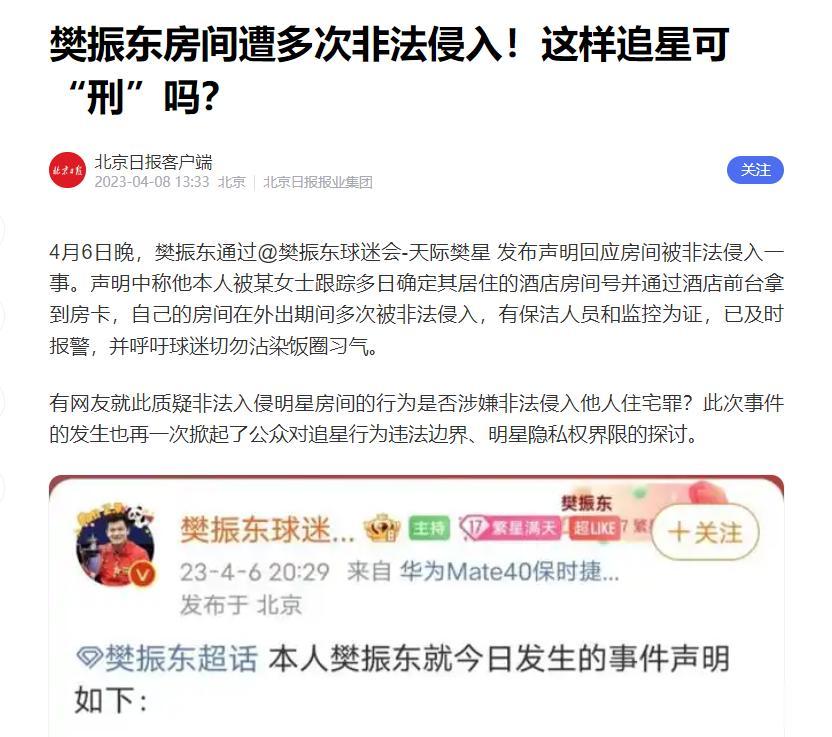信息来源:樊振东房间遭多次非法侵入!这样追星可“刑”吗?