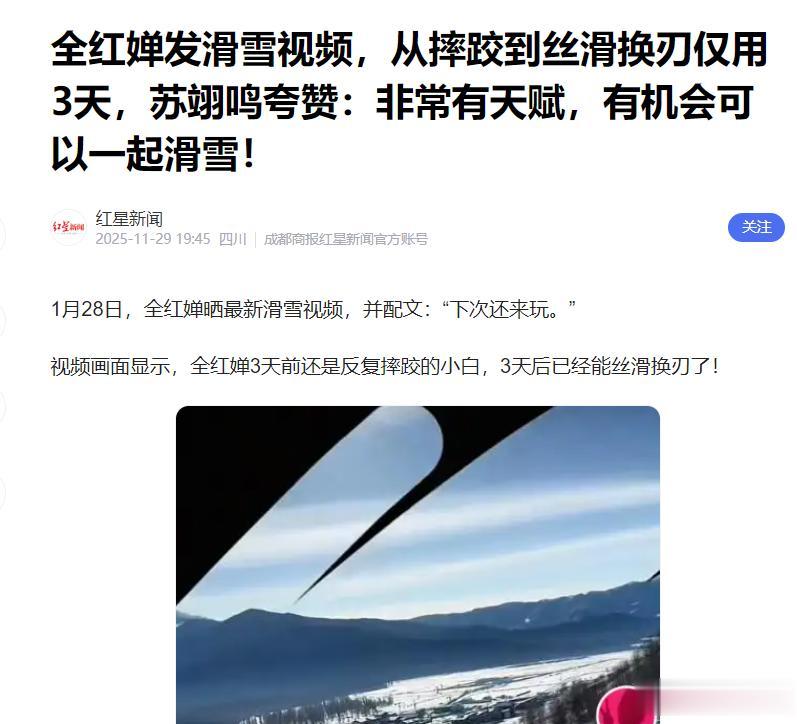 信息来源:全红婵发滑雪视频,从摔跤到丝滑换刃仅用3天,苏翊鸣夸赞:非常有天赋,有机会可以一起滑雪!