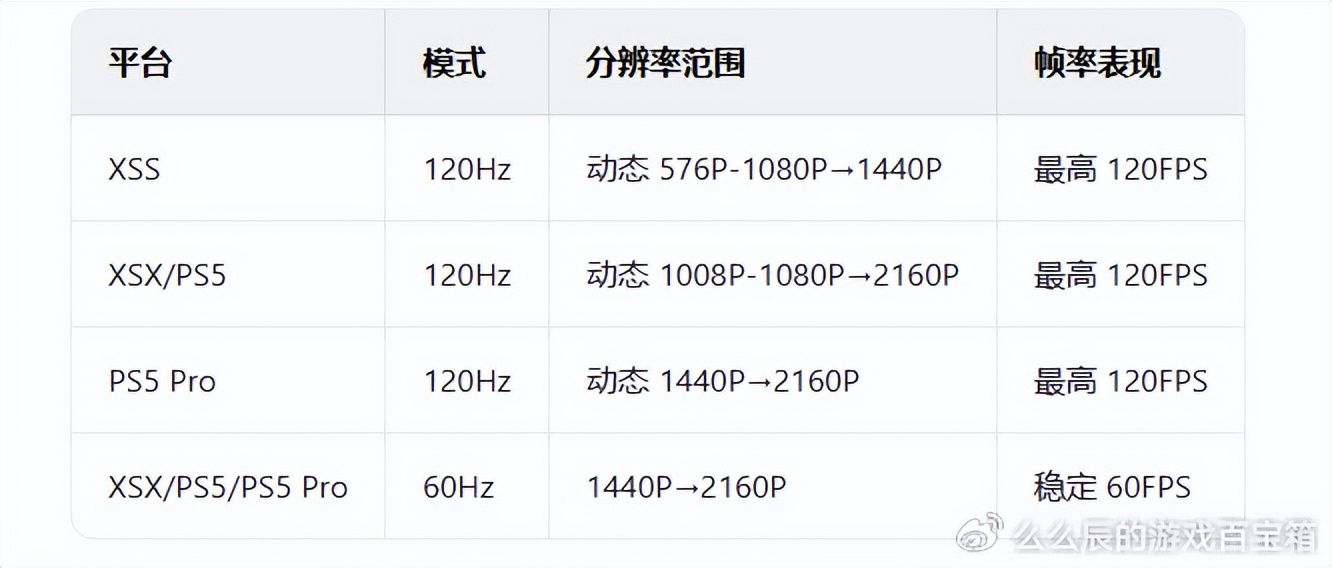 120Hz 模式:XSS(动态 576P-1080P→1440P,最高120FPS);XSX/PS5(动态 1008P-1080P→2160P,最高120FPS);PS5 Pro(动态 1440P→2160P,最高120FPS)60Hz 模式:XSX/PS5/PS5 Pro 均为 1440P→2160P,稳定 60FPS