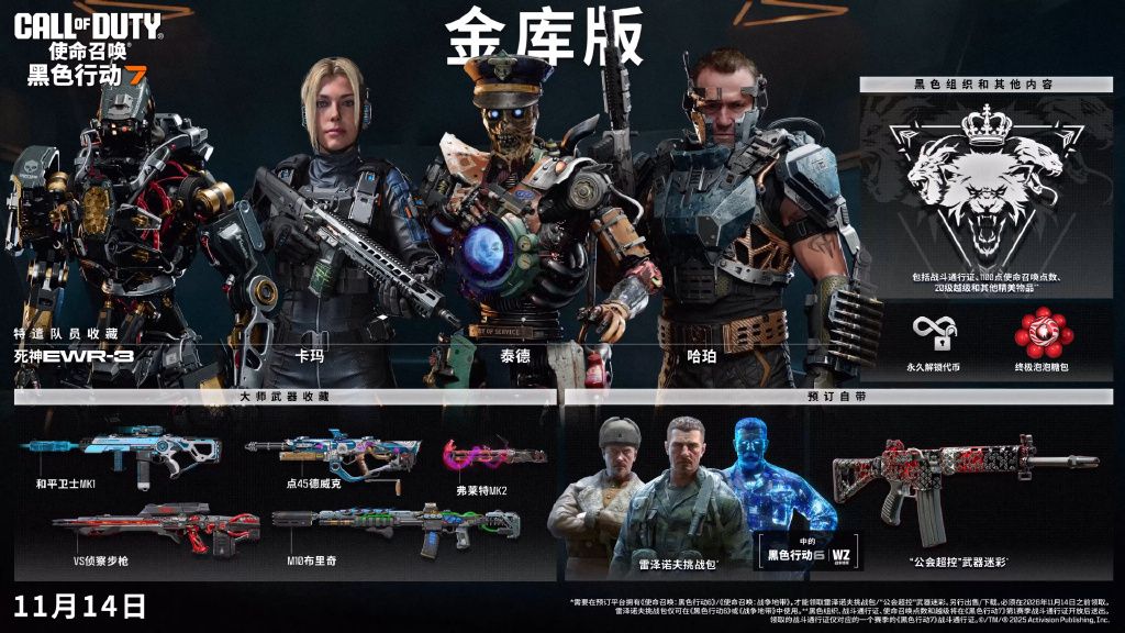 预购福利全平台统一:预购任意版本均可解锁 “研究观察组雷泽诺夫”“斯大林格勒雷泽诺夫”“记忆体雷泽诺夫” 三款特遣队员外观,以及 “公会超控” 动态武器迷彩。