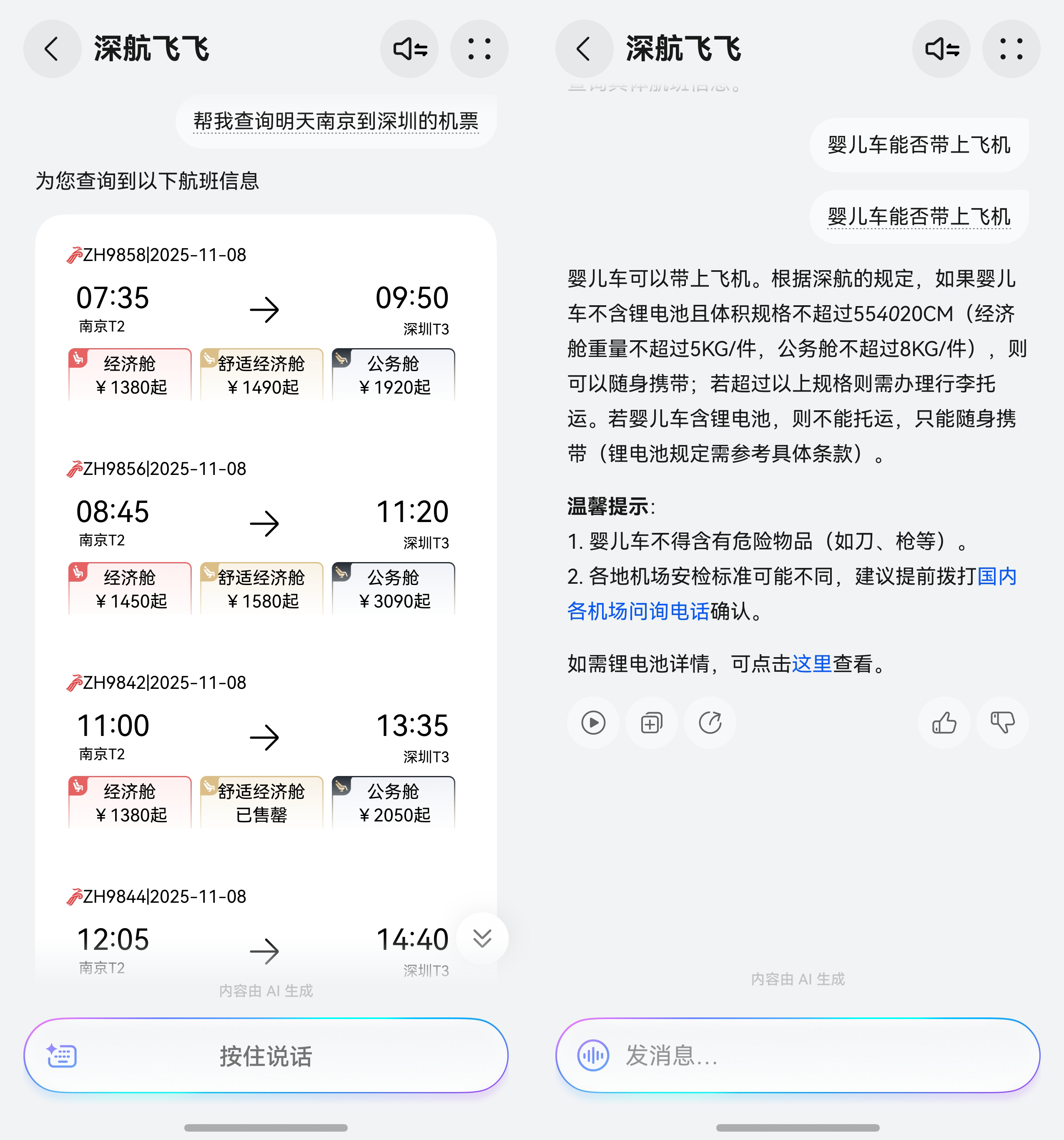 不过说实话,比起抽奖,我更想安利深航跟鸿蒙携手推出的专属智能体“深航飞飞”。不仅可以和它打字交流,还可以用语音实现交互。查机票?退改签?通通一句话搞定。在值机时也可以询问“深航飞飞”:“我想看日出坐哪边?”“哪侧能看到雪山?”,它都能秒变旅行设计师,推荐可以欣赏日升日落、雪山海岸线的VIP观景位。