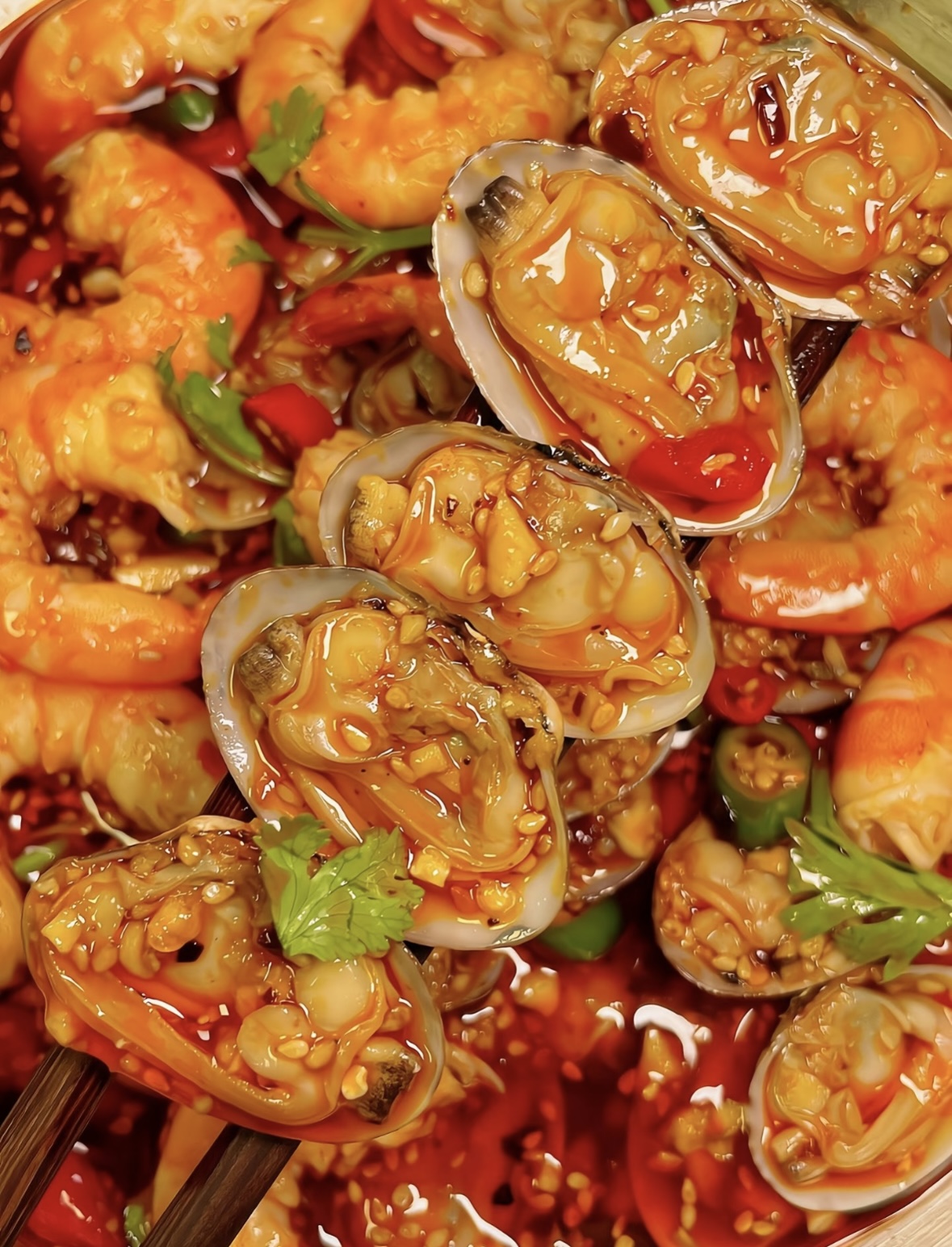 把冰镇好的海鲜控干水分,扔进捞汁里“泡澡”。这里有个“时间魔法”:30 分钟是“初吻级”入味,壳里带一点点汤,咬下去像先亲一口再递情书;2 小时是“热恋级”,酸辣完全钻进肉纤维,每一口都在尖叫;放过夜就是“老夫老妻”,味道浓到能直接下酒。我通常忍到 1 小时就投降,边追剧边偷吃,虾头一拧,“嗞”一声汤汁飙出来,酸辣冲到脑门,空调都不用开 26 度。