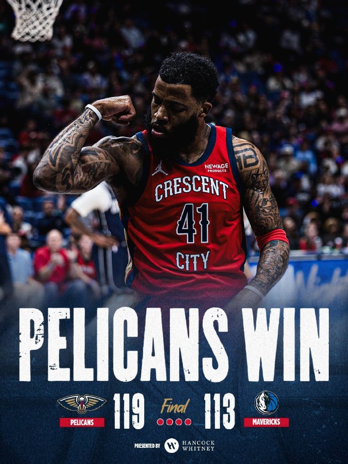 第四节比赛中,鹈鹕最多还落后达到11分,但他们单节40-26净胜14分,成功逆转独行侠。独行侠输给鹈鹕后,又遭遇两连败,战绩变成11胜19负,排在西部第十二。
