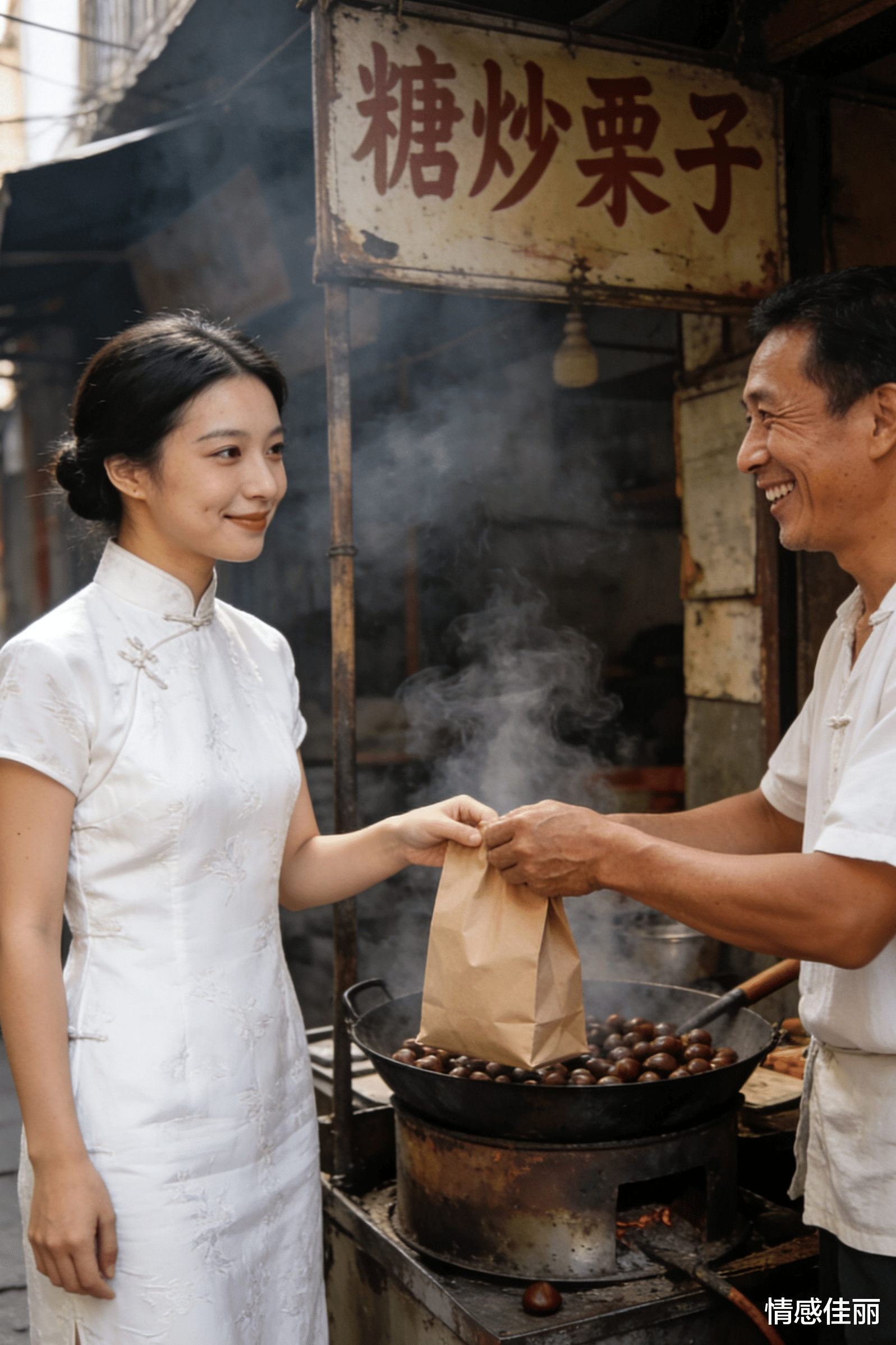 天色渐渐暗了,巷口的灯亮起来,暖黄的光,把我的影子拉得很长。我握着手里的糖炒栗子,慢慢往回走。旗袍的襟口,又被风吹开了一角,我没有再拢。就让风,带着那些没说出口的话,散了吧。