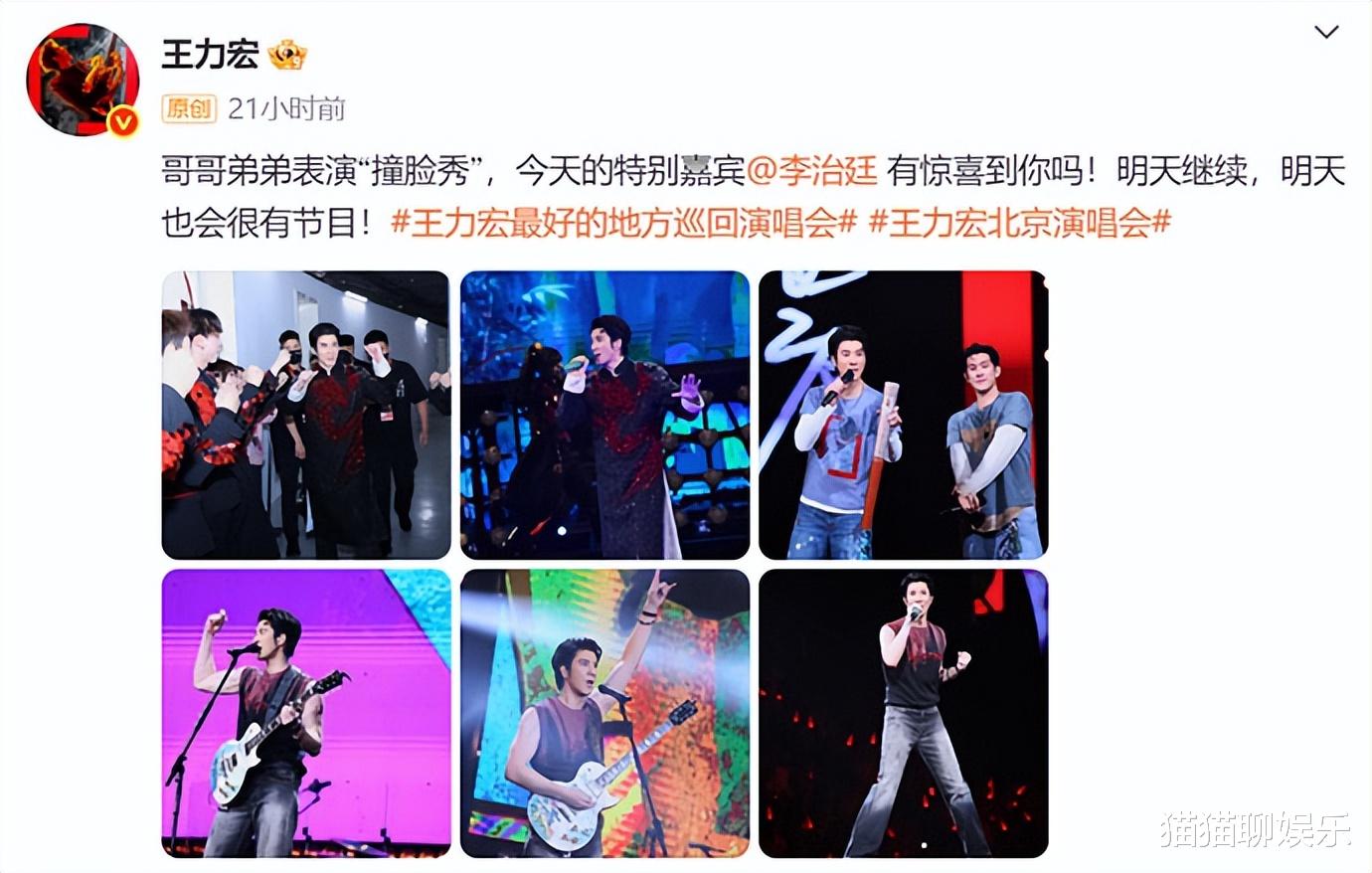 此次,北京站演唱会,王力宏还与李治廷身穿相似服装,两人现场合唱《依然爱你》《One World One Dream》等歌曲。而同台二人,从外貌、发型、身材,再到说话方式、弹吉他动作,都让观众直呼“难分真假”。 线上网友们也热闹非凡,纷纷呼吁“凑齐蒲巴甲实现消消乐三兄弟”