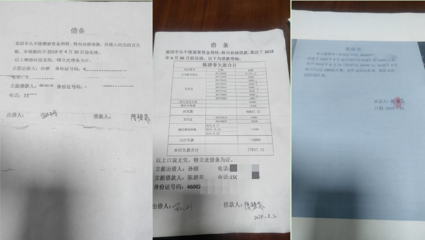 更蹊跷的是,2020年8月2日,陈碧菲突然出具两张借条:一张写明“借款4万元,2018年4月30日前归还”,却无借款日期;另一张虽注明“借款时间为2020年8月2日”,却又声称该款应于2018年还清。时间逻辑严重矛盾,疑似伪造债务凭证以规避法律责任。