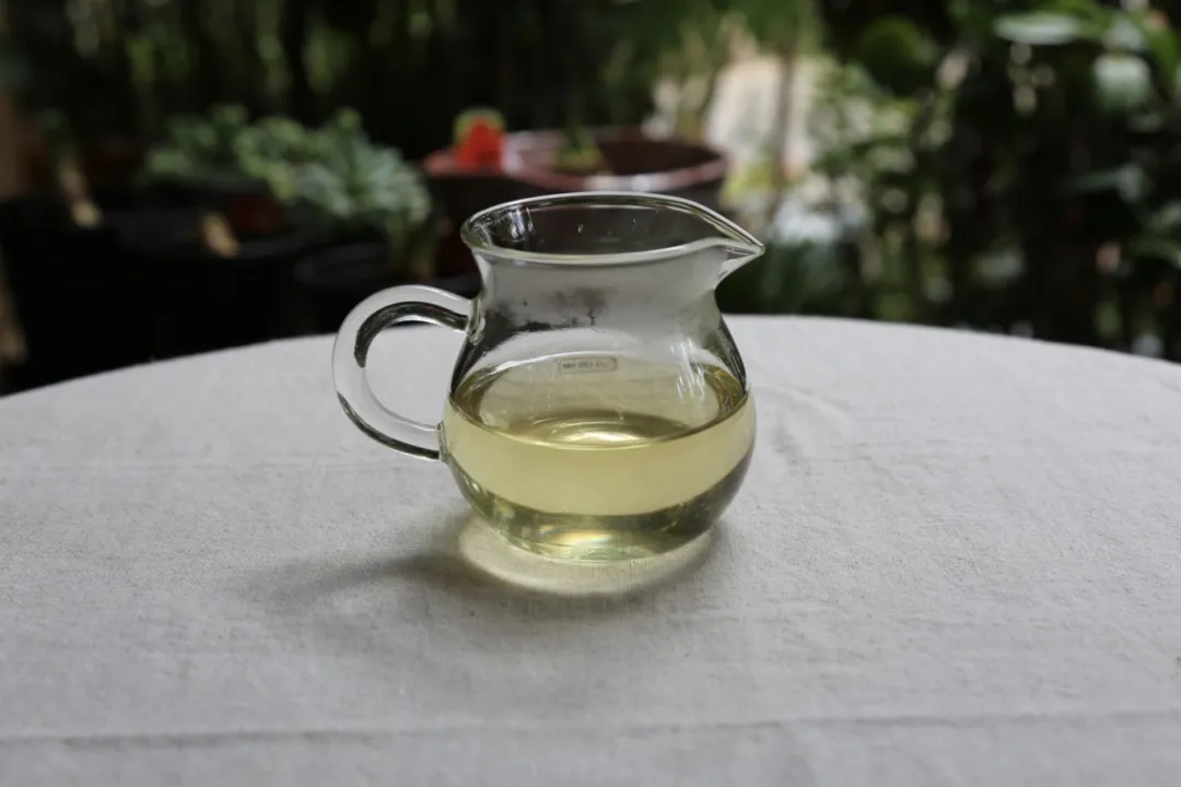 茶汤清亮,颜色很浅,呈黄绿色,香气非常浓郁,呈花蜜香中带有明显的野韵(骚香味)。