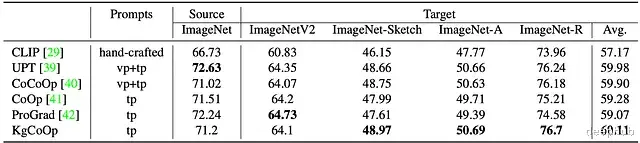 其中 d(x,__w y ^__clip) 代表余弦相似度,(w^__clip) 代表来自手工模板的嵌入。CoOp 将这些模板替换为 M 个可学习的上下文向量 V= {v1, v2, …, vM };此时 Prompt 变为 ti^coop = {v1 , v2 , ..., vM , ci },c i 为类别 Token。