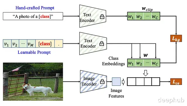 Knowledge-guided Context Optimization(KgCoOp)KgCoOp 引入了一种新的正则化框架。该框架不再允许 Prompt 在优化过程中自由漂移,专门加入了一个知识引导损失 (Lkg),专门用于最小化可学习 Prompt 与手工 Prompt 之间的差距。