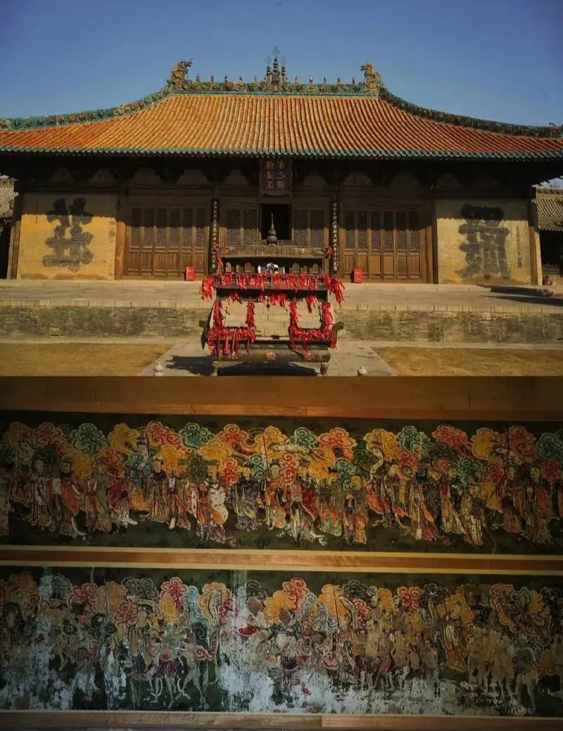 战火涅槃:从废墟到“东方壁画博物馆”永安寺的传奇始于一场浩劫。元至元二十六年(1289年),浑源大地震摧毁寺院,僧侣怀敬法师发愿重建。现存传法正宗殿(大雄宝殿)建于延祐二年(1315年),其珍贵之处在于完整保存了元明两代叠加绘制的四壁壁画,总面积达887平方米,规模仅次于芮城永乐宫。
