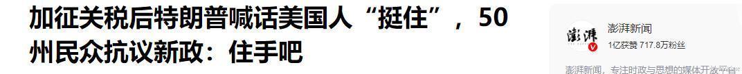 澎湃新闻讯:特朗普在加关税后呼吁美国人要坚持,但50州民众纷纷反对新政:别再继续了特朗普在宣布加征关税后,直接向全美国民众喊话,希望大家能够坚持住,挺过这个难关。然而,他的这一举动并没有得到广大民众的积极响应。相反,来自美国50个州的民众纷纷走上街头,举行抗议活动,明确表示对新政策的不满。他们高呼口号,要求政府停止加征关税,认为这样的政策只会给普通民众带来更大的负担。民众们的声音清晰而坚定,他们希望政府能够倾听基层的声音,重新考虑这一政策。特朗普的初衷可能是希望通过加征关税来保护国内产业,但显然,这一政策并没有得到广大民众的支持。民众的抗议活动表明,他们更希望政府能够采取更加合理、公正的政策,以促进国家的发展和民众的福祉。