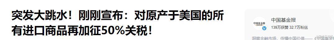 突发重磅!中国刚刚放出大招:对所有来自美国的进口货物加收50%的额外关税!据最新消息,中国决定对美国进口的所有商品实施新的关税政策,加征幅度高达50%。这一决定无疑给市场带来了巨大的震动,犹如一场突如其来的大跳水,让人措手不及。此次加征关税的措施覆盖了所有原产于美国的进口商品,显示出中国在贸易问题上的坚定立场和决心。这一决策无疑将对中美两国的贸易关系产生深远影响,也引发了全球市场的广泛和讨论。