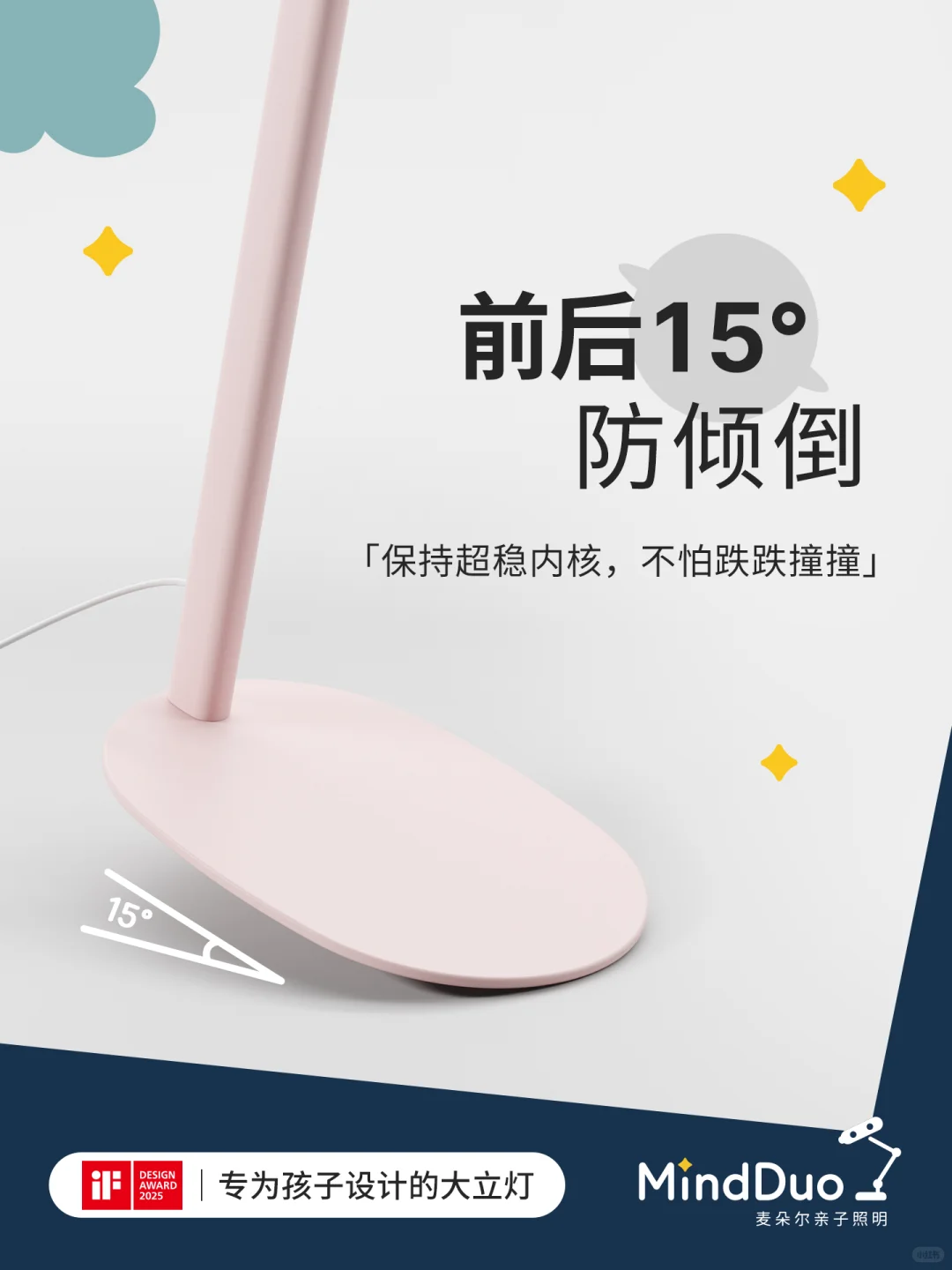 10kg超重底座 + 前后15°防倾倒设计。实测用力撞击灯体仍纹丝不动,孩子奔跑玩耍时无需担心碰倒灯具,免除安全隐患。