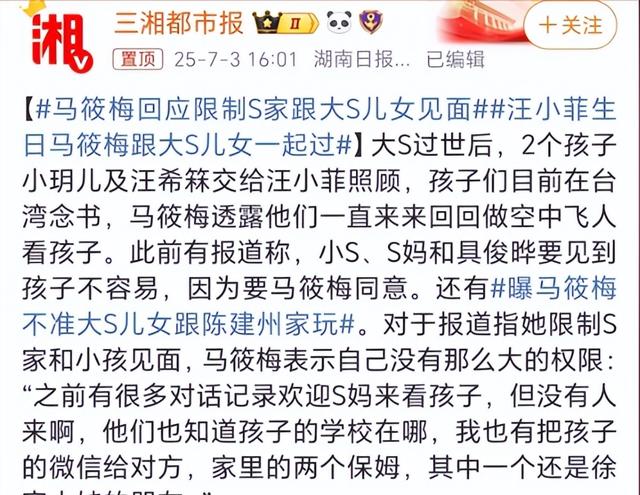 曝马筱梅不准大S儿女跟陈建州家玩 认为此举对孩子不好——闽南网台媒曝大S子女监护权归属:汪小菲将依法行使亲权,子女或回北京生活——极目新闻