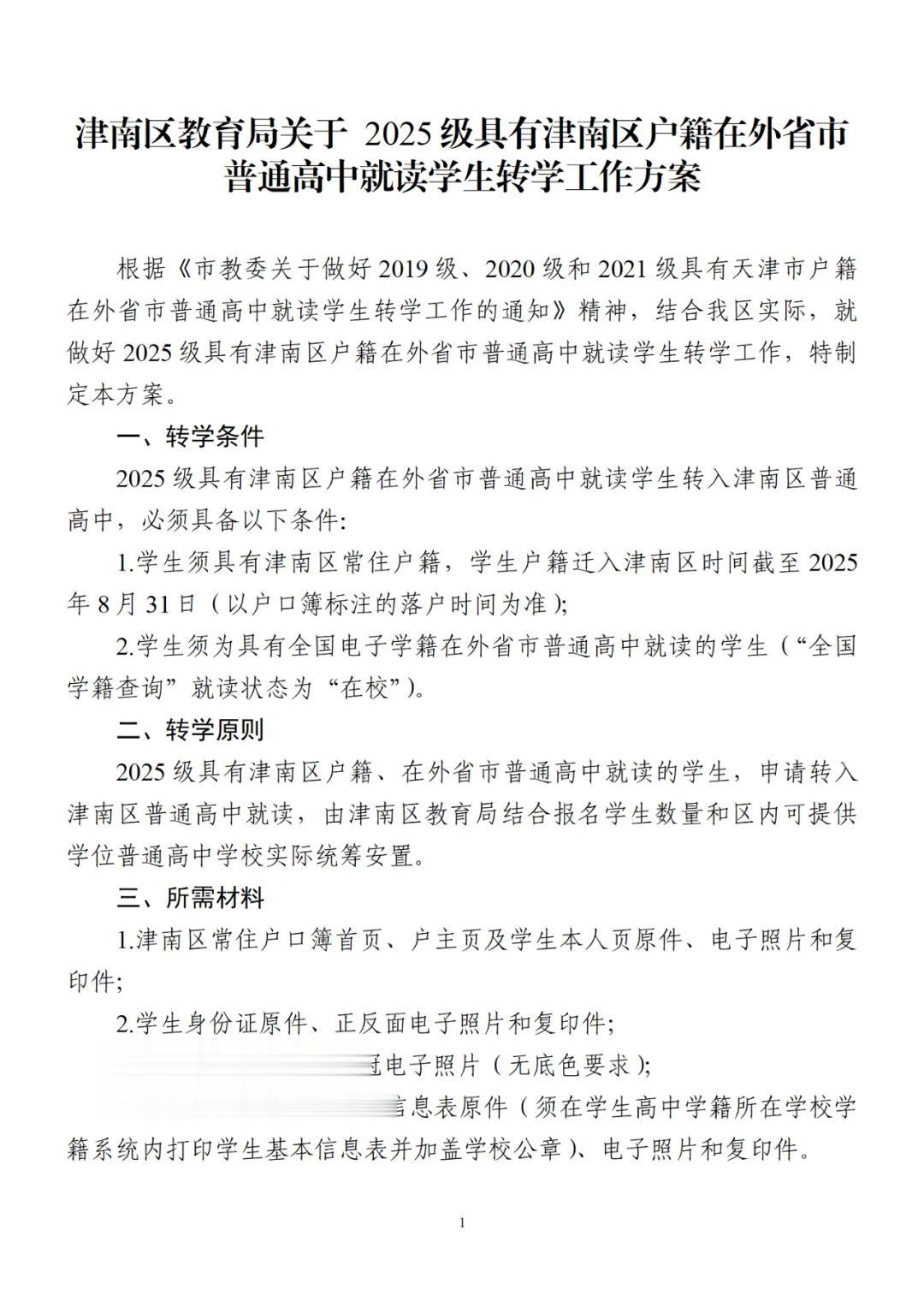津南区教育局关于2025级具有津南区户籍在外省市普通高中就读学生转学工作方案