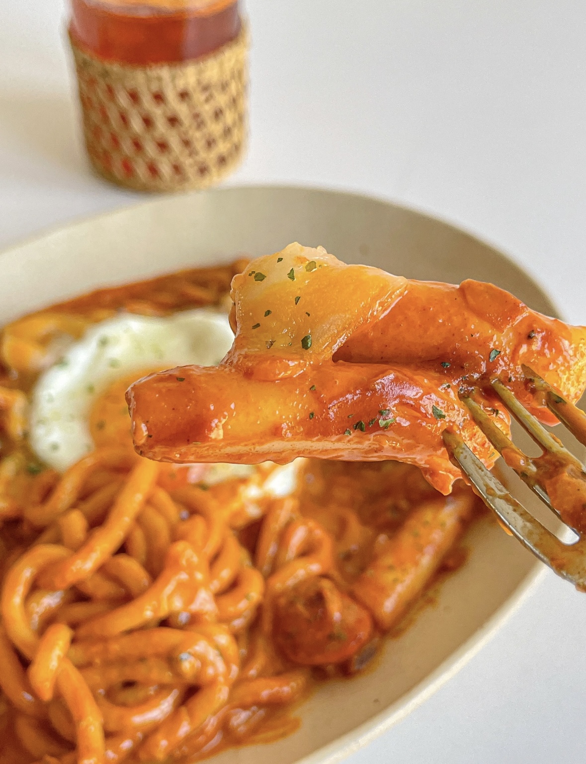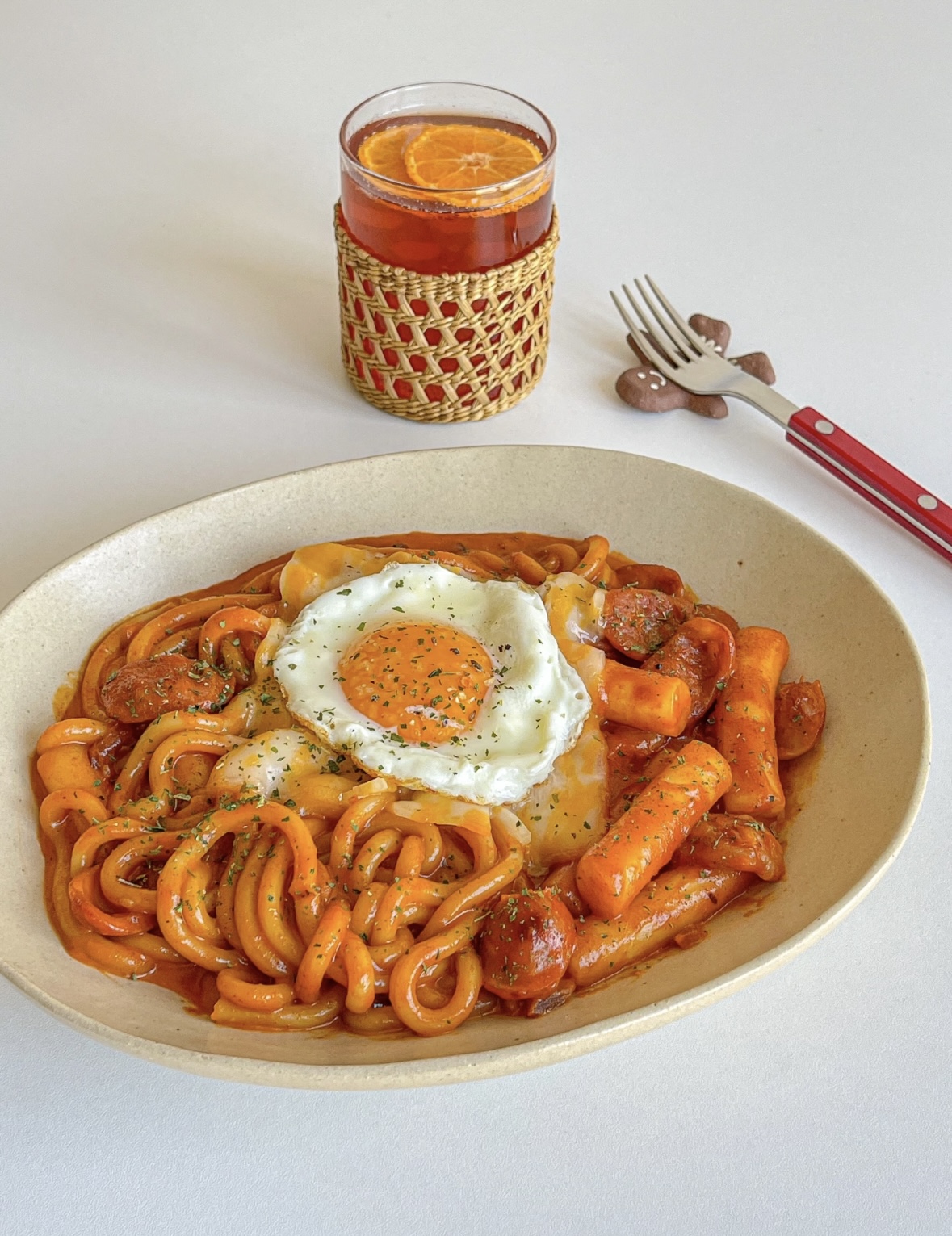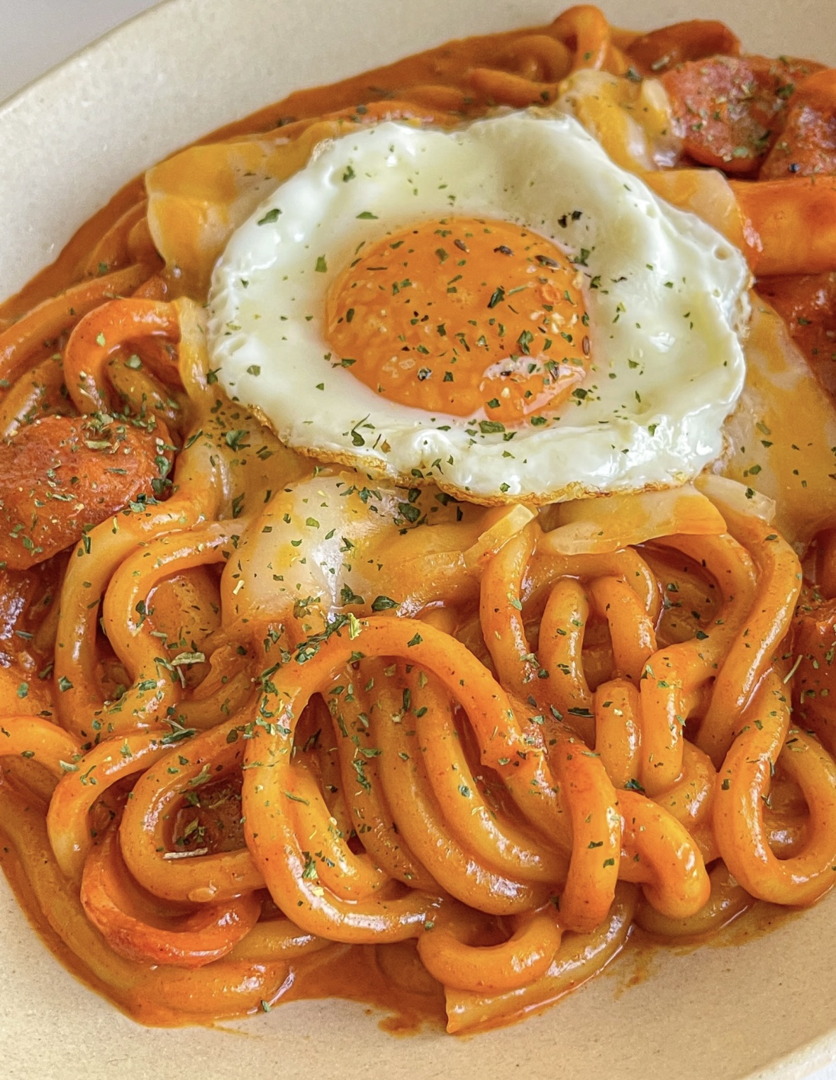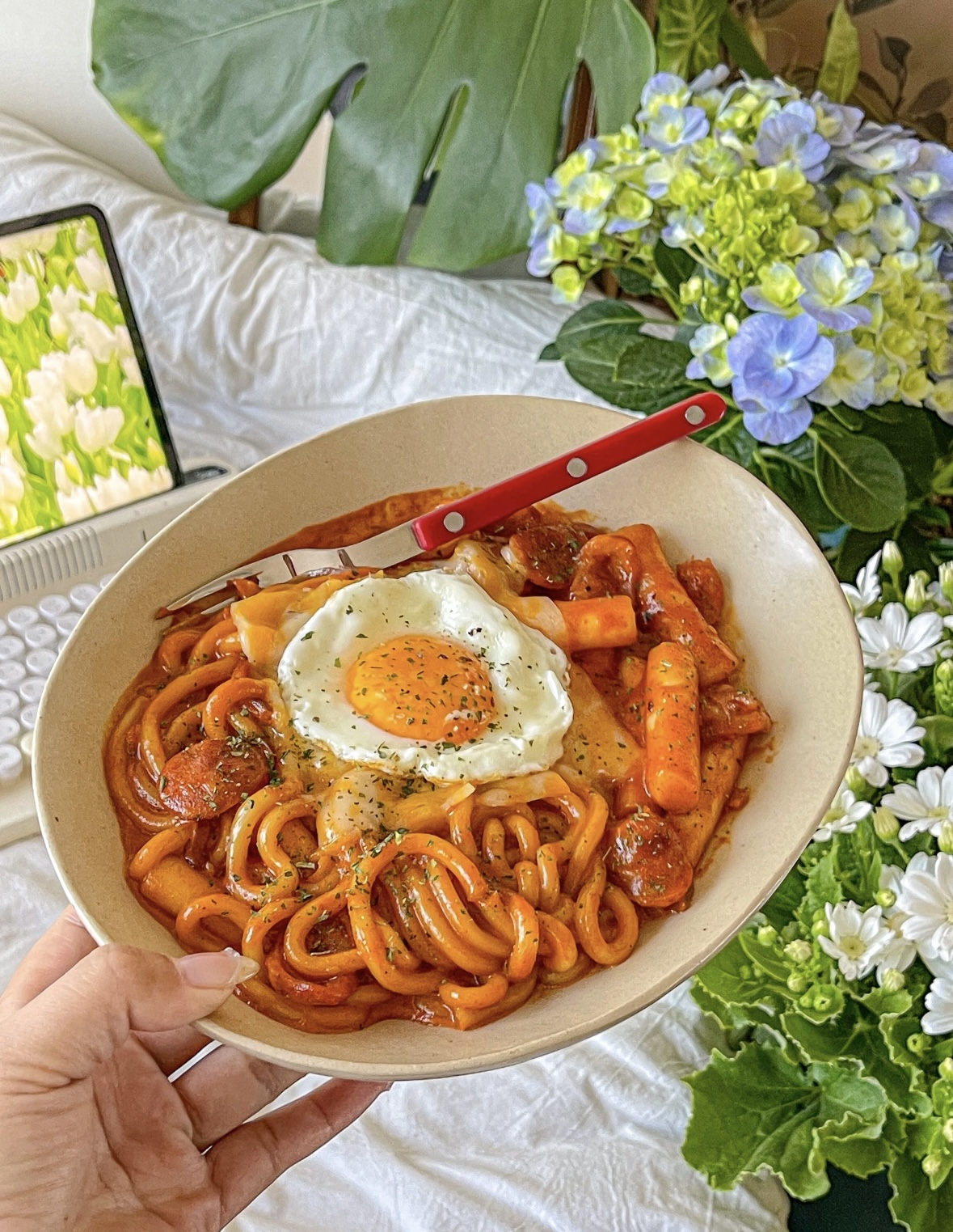 第一口,先吸溜一大筷子,面条滑得像是涂了润滑油,辣酱先给舌头一个拥抱,随后奶油的绵密赶来救场,把辣度轻轻包裹,像毛毯捂住火星。年糕在齿间“噗嗤”一下,米香混着奶辣,瞬间把大脑空白格全部填满。烤肠的烟熏味见缝插针,洋葱的甜在最后收尾,层次感比偶像团体舞台还整齐。溏心蛋被戳破那刻,金色蛋液流进红汤,秒变“黄金捞汁”,再舀一勺浇在面上,光看着就颅内高潮。