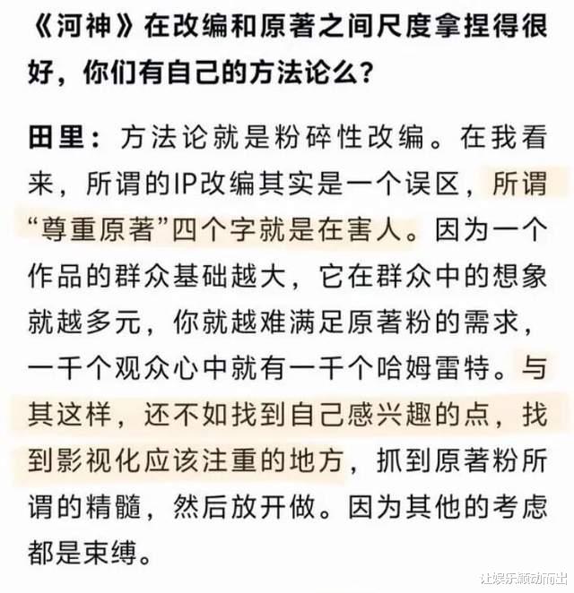与此同时,尾鱼小说的书粉也没闲着,飞速翻出《枭起青壤》导演田里在八年前拍《河神》时的一段采访,文字中“尊重原著是在害人”如同一颗延时炸弹,刚好在剧版遭遇质疑的当口“砰”地炸开。书粉怒火高涨,网友判断混乱,评论区从“你没懂原著”吵到“你就是不尊重原著”,再吵到“你拍的根本不是原著”。