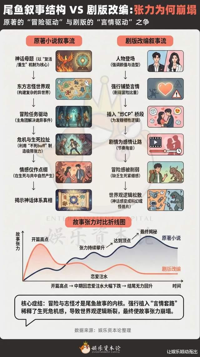 当然,比起“被男凝”的尾鱼女主们,真正让阿水困惑的,其实是尾鱼IP为什么总在改编过程中被推往“言情之路”。尾鱼宇宙的底层结构根本不是情感驱动,而是东方奇诡体系下的冒险驱动,它们都绕着同一个神话“母题”展开:女主可以重生。