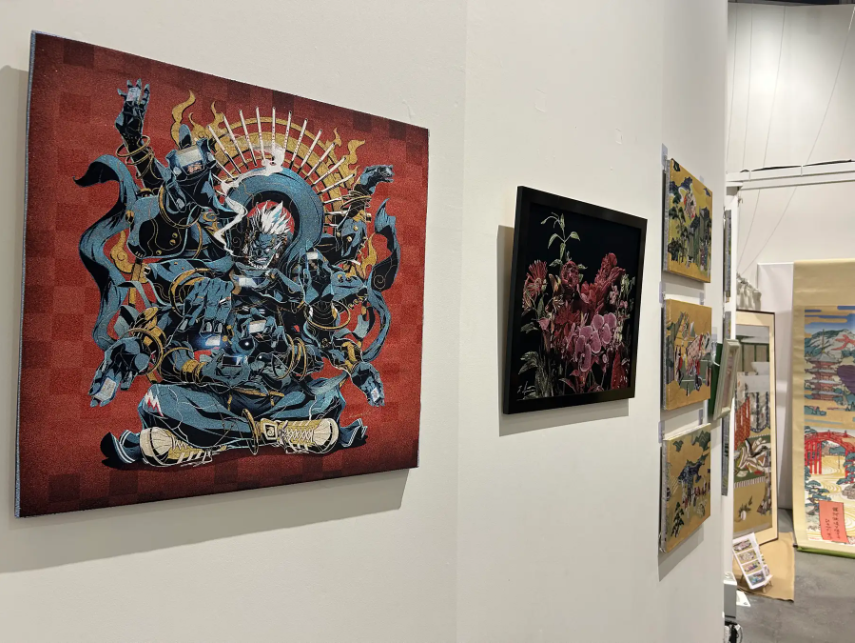 此次展出的作品最大亮点,是将传统技法与现代艺术巧妙融合。展览中出现了首度采用アメコミ风格设计的西陣織艺术作品,如穿着运动鞋的不动明王与麻将元素相结合的创意造型,打破了人们对传统工艺的刻板印象。西陣織不再仅仅是历史的延续,而是成为了承载想象与创新的媒介,展示了传统工艺在当代的无限可能。
