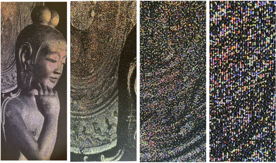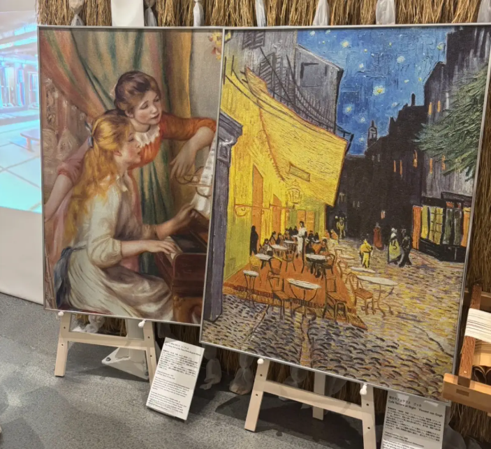 此外,展览中还尝试将世界名画以西陣織再现。株式会社西陣アート織製作所选取了ゴッホ的《夜のカフェテラス》和ルノワール的《ピアノに寄る少女たち》,通过精密的レピア織機,将油画的色彩与质感在织物中重现。远观时,这些作品宛如画作或照片般生动,近看却能看到每一根细密的丝线交错叠加,形成如同点描画般的视觉效果。放大镜下,纤细的丝线闪烁着光泽,犹如星空般璀璨,呈现出传统工艺难以企及的立体与层次感,这种“双重美感”使西陣織以独特的方式焕发艺术生命。