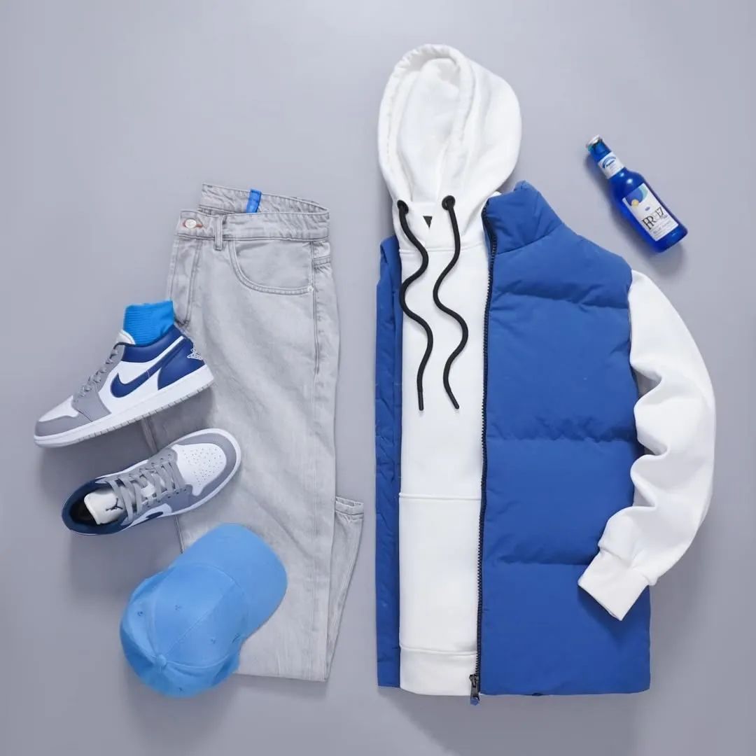 搭配要点:蓝色棉服马甲保暖且具层次感,其深邃色调彰显沉稳。白色连帽卫衣在领口袖口露出,增添清新活力。灰色牛仔裤中和色彩,修饰腿型。NK潮鞋以独特设计与品质,为整体注入潮流灵魂。