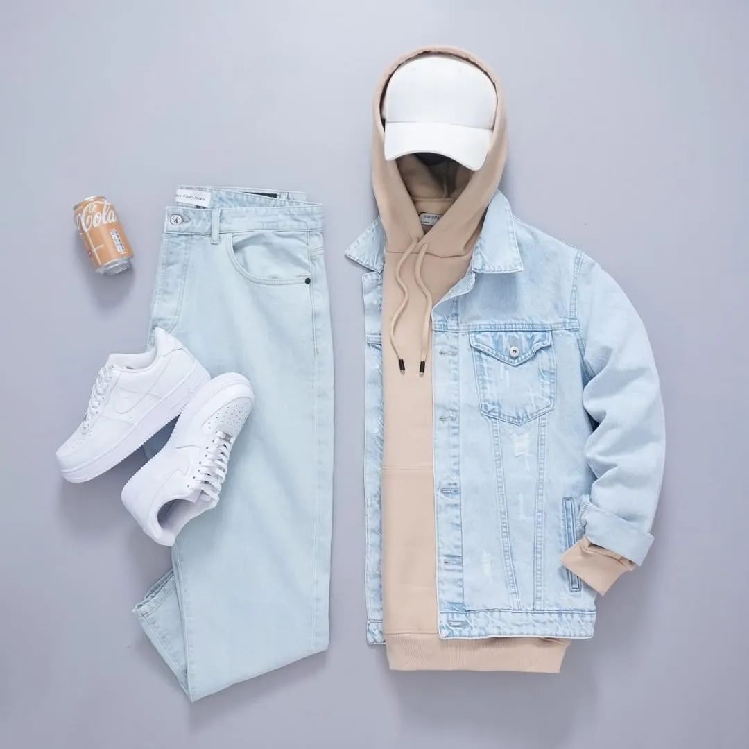 搭配要点:白色连帽卫衣尽显清爽与随性,为整体造型奠定了简洁的基调。黑色牛仔裤修身的版型和沉稳的色调,凸显出利落与干练。黑白AJ潮鞋作为点睛之笔,呼应了整体的黑白配。黑白棒球帽的加入,为头部增添了一份时尚的点缀。look2:浅蓝牛仔夹克+卡其色连帽卫衣+浅蓝牛仔裤+白色板鞋