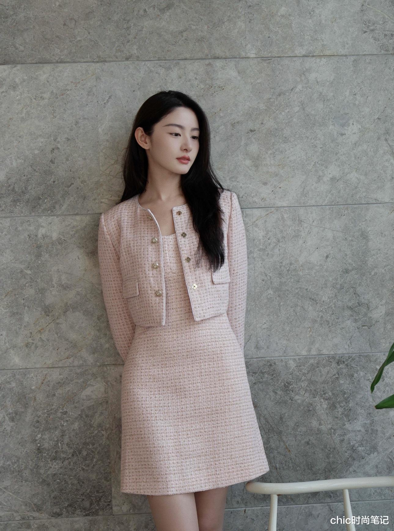 粉色系小香风外套配上同系列的连衣裙,整体看着温婉且甜美,如果要搭配饰品的话也可以选择珍珠款式和小香风包包。